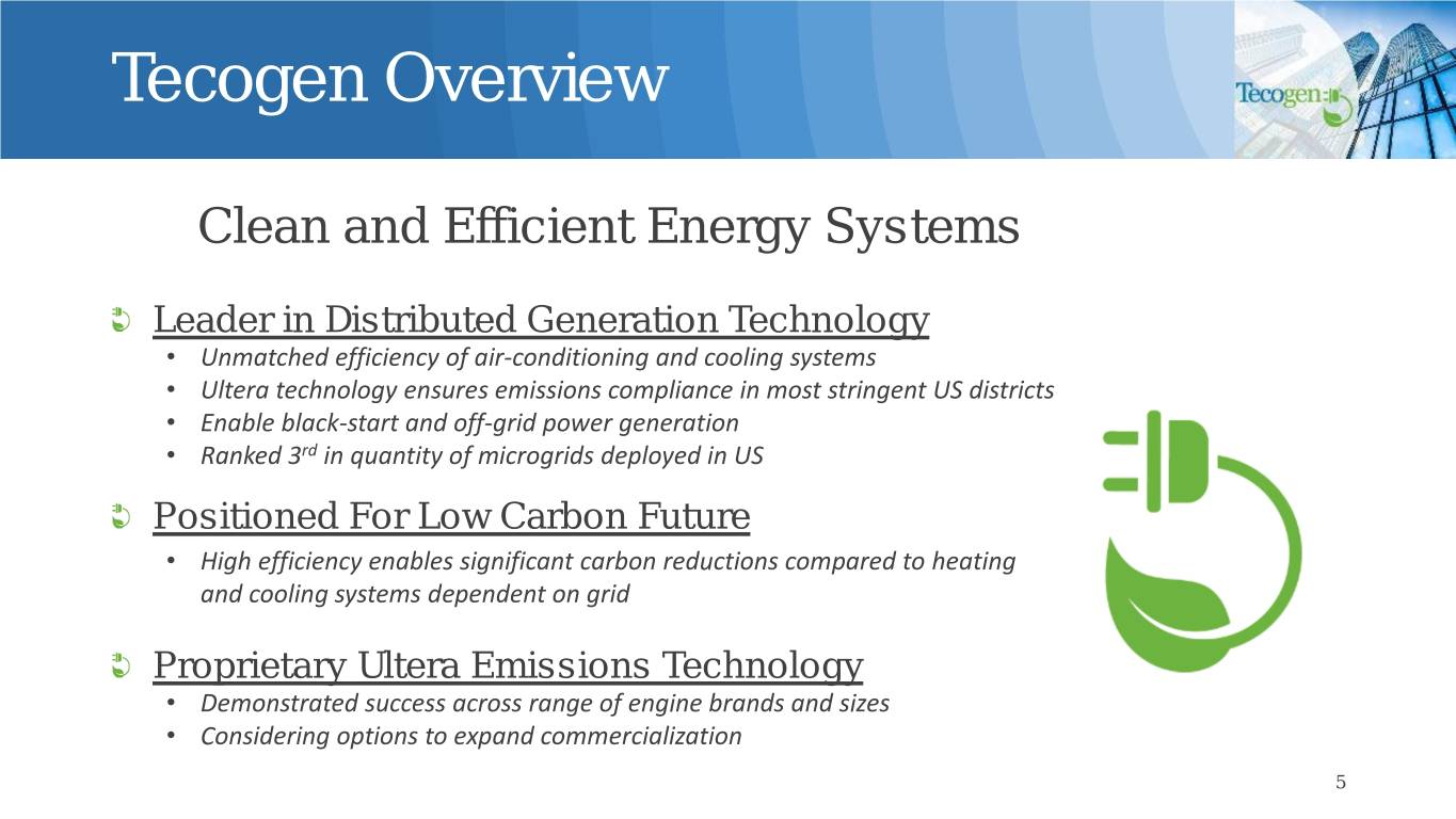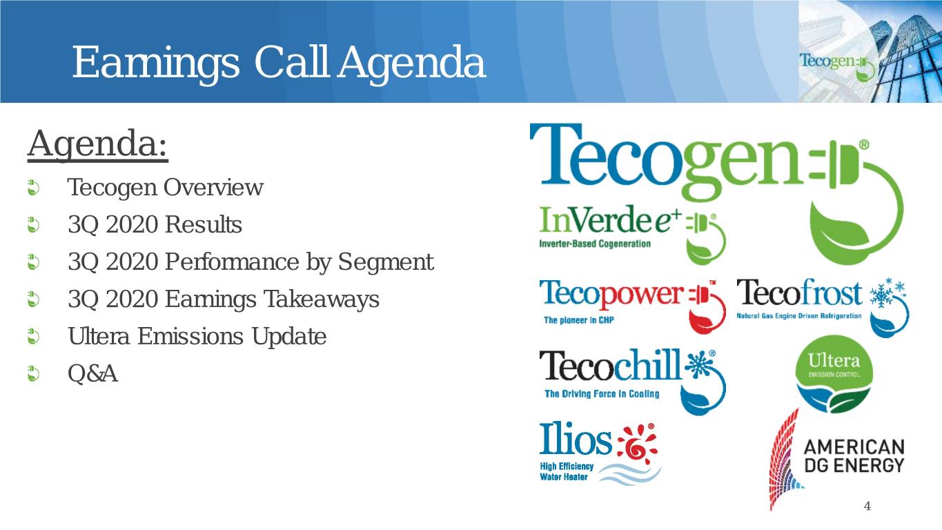 Earnings Call Agenda Agenda: Tecogen Overview 3Q 2020 Results 3Q 2020 Performance by Segment 3Q 2020 Earnings Takeaways Ultera Emissions Update Q&A 4