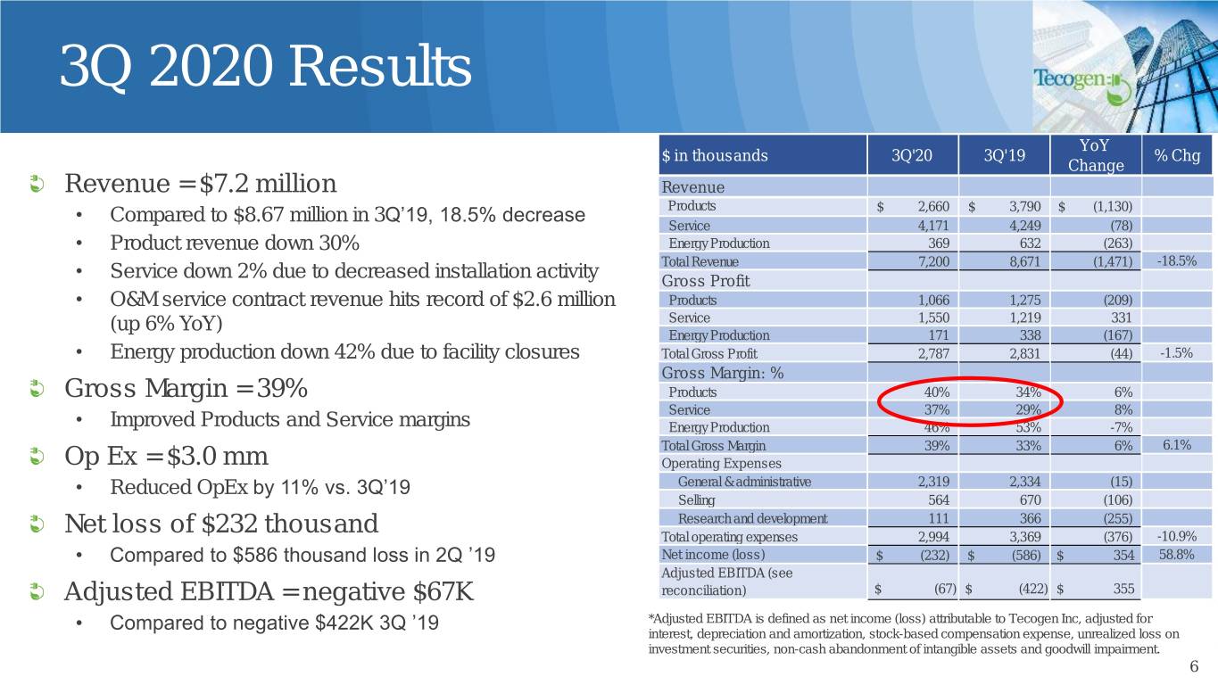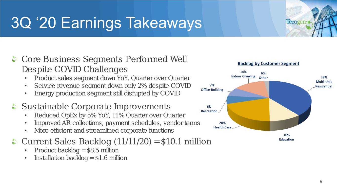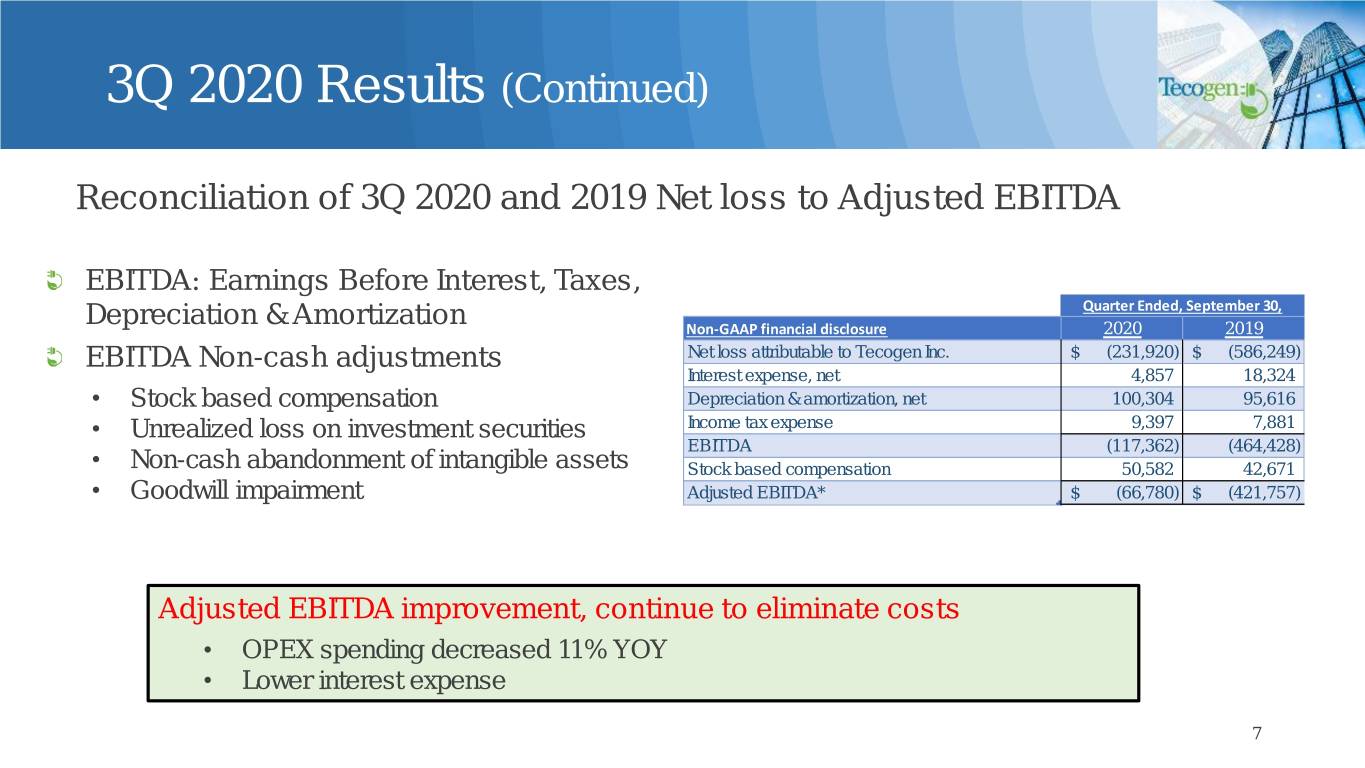 3Q 2020 Results (Continued) Reconciliation of 3Q 2020 and 2019 Net loss to Adjusted EBITDA EBITDA: Earnings Before Interest, Taxes, Depreciation & Amortization Quarter Ended, September 30, Non-GAAP financial disclosure 2020 2019 EBITDA Non-cash adjustments Net loss attributable to Tecogen Inc. $ (231,920) $ (586,249) Interest expense, net 4,857 18,324 • Stock based compensation Depreciation & amortization, net 100,304 95,616 • Unrealized loss on investment securities Income tax expense 9,397 7,881 EBITDA (117,362) (464,428) • Non-cash abandonment of intangible assets Stock based compensation 50,582 42,671 • Goodwill impairment Adjusted EBITDA* $ (66,780) $ (421,757) Adjusted EBITDA improvement, continue to eliminate costs • OPEX spending decreased 11% YOY • Lower interest expense 7