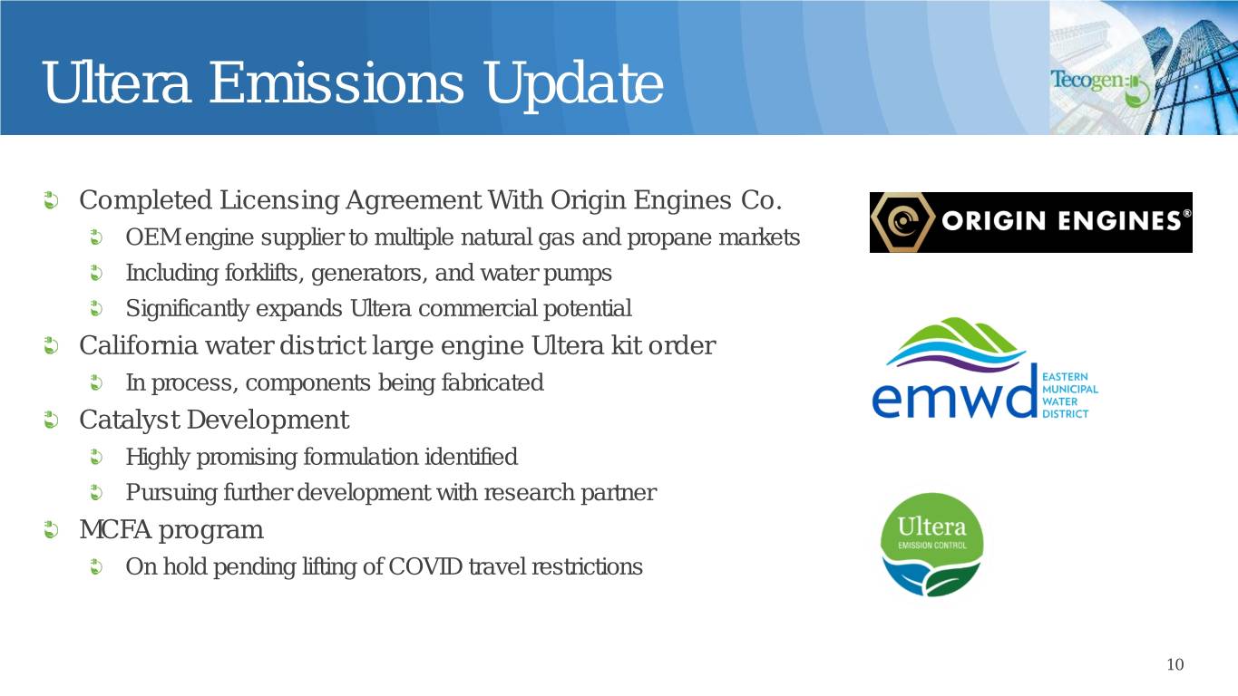Ultera Emissions Update Completed Licensing Agreement With Origin Engines Co. OEM engine supplier to multiple natural gas and propane markets Including forklifts, generators, and water pumps Significantly expands Ultera commercial potential California water district large engine Ultera kit order In process, components being fabricated Catalyst Development Highly promising formulation identified Pursuing further development with research partner MCFA program On hold pending lifting of COVID travel restrictions 10