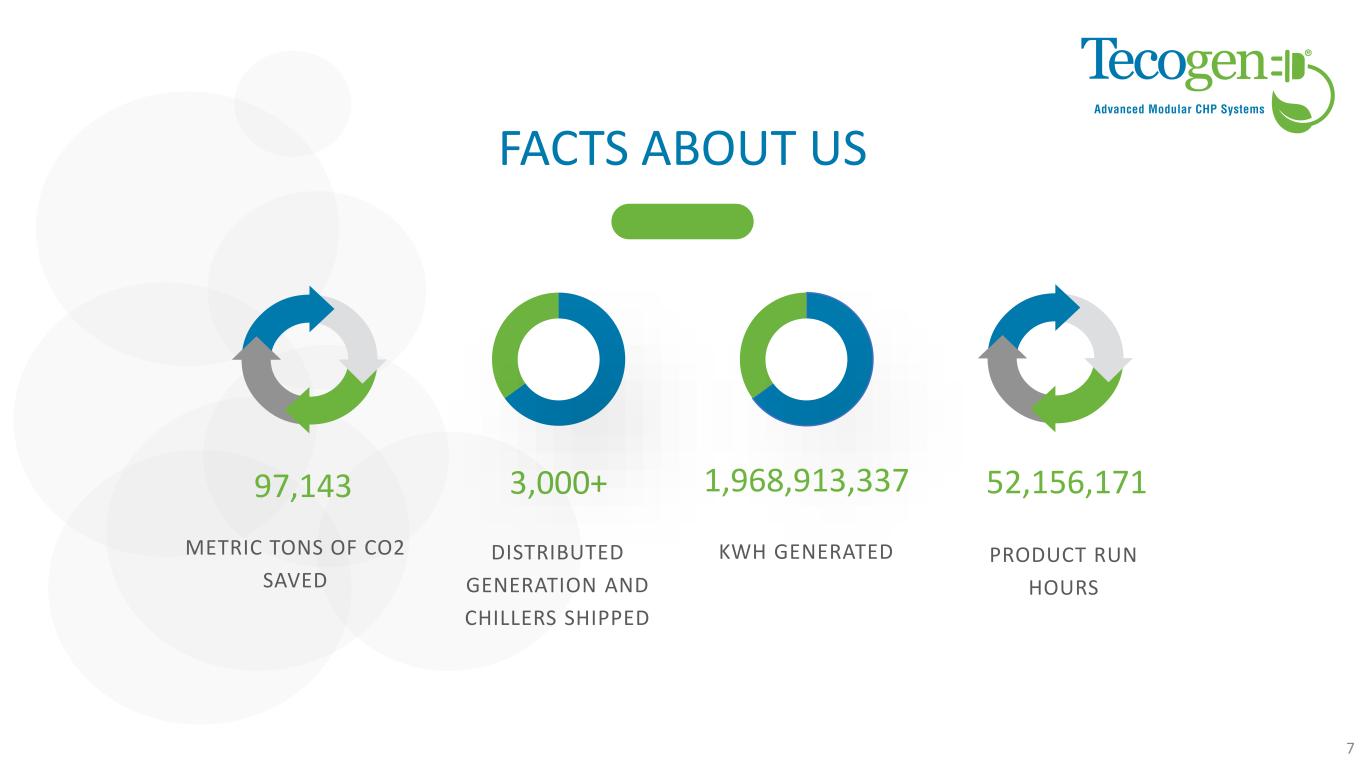 DISTRIBUTED GENERATION CLEAN COOLING Chillers with lower operating cost and lower greenhouse gas footprint compared to an equivalent electric chiller EMISSIONS 3rd in number of microgrids installed in North America Near zero NOx and CO emissions systems for gasoline, propane and natural gas engines 6