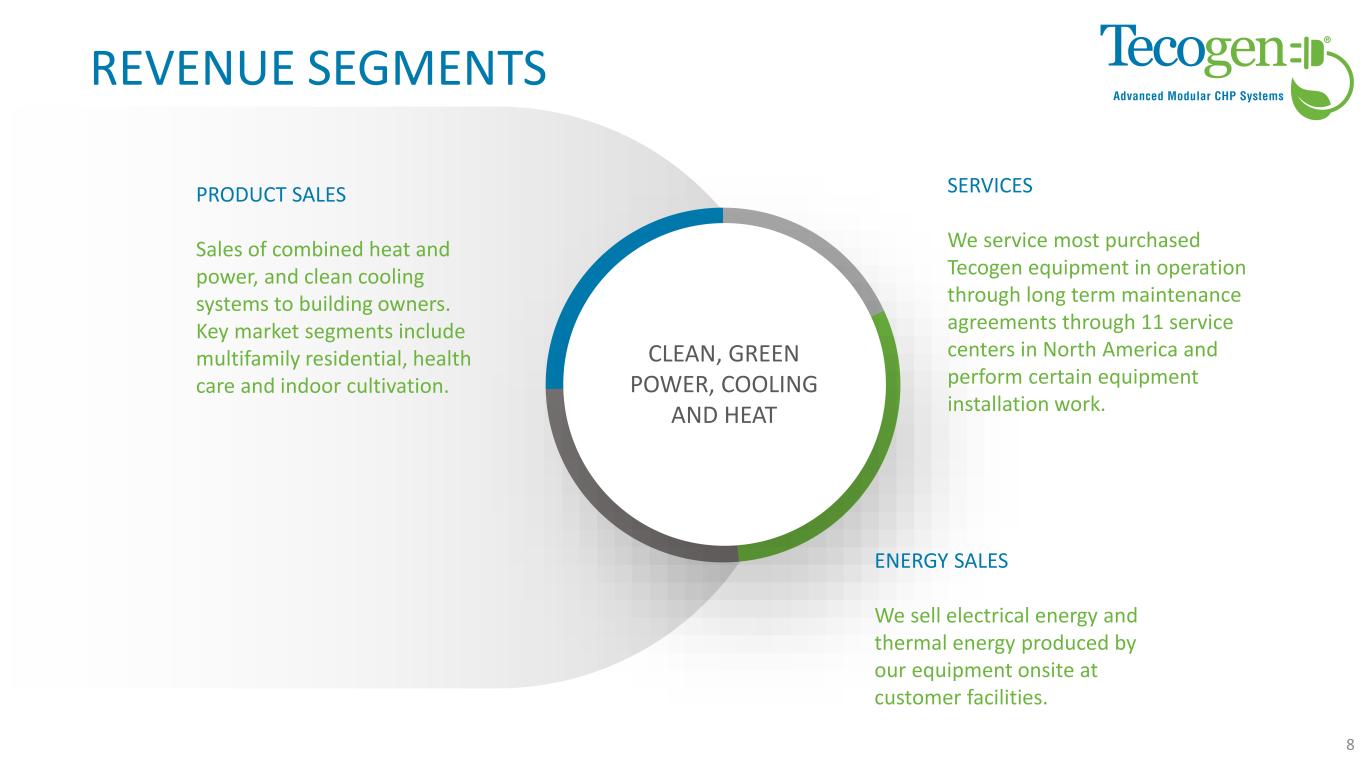 REVENUE SEGMENTS We service most purchased Tecogen equipment in operation through long term maintenance agreements through 11 service centers in North America and perform certain equipment installation work. SERVICES CLEAN, GREEN POWER, COOLING AND HEAT Sales of combined heat and power, and clean cooling systems to building owners. Key market segments include multifamily residential, health care and indoor cultivation. PRODUCT SALES We sell electrical energy and thermal energy produced by our equipment onsite at customer facilities. ENERGY SALES 8