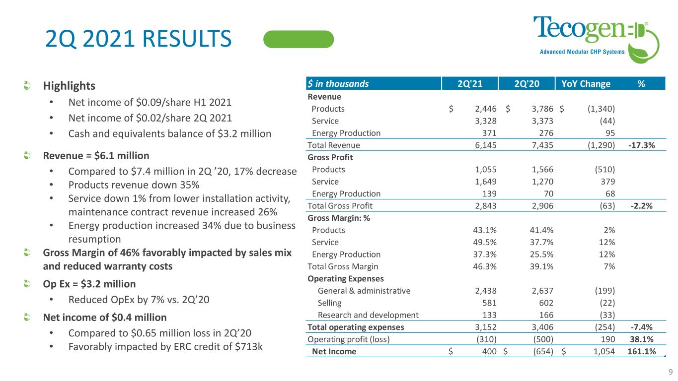 2Q 2021 EARNINGS TAKEAWAYS Business Segments Recovering from COVID Challenges • Product sales down; Product backlog increased 12% from year end • Service contracts revenue increased 26% QoQ despite COVID setbacks. • Energy production revenues are recovering Stable Cash Position • Quarter-end cash and equivalent balance of $3.2 million Sustainable Corporate Improvements • Reduced OpEx by 7% QoQ • Improved margins in all segments • Operational and manufacturing improvements Current Backlog = $10.4 million • Product backlog = $10.2 million Multi-Family Residential 22% Indoor Growing 25% Other 15% Healthcare 38% Backlog by Customer Type 12