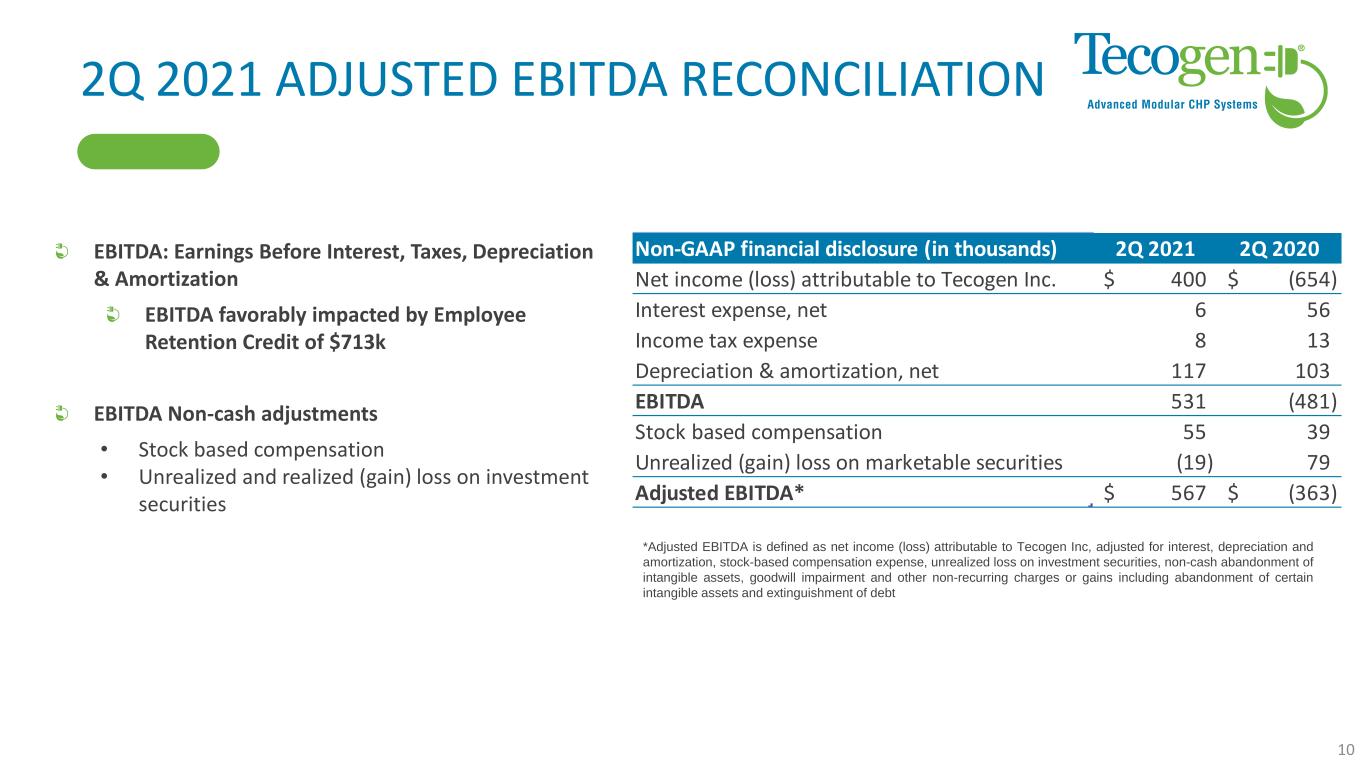 2Q 2021 RESULTS Highlights • Net income of $0.09/share H1 2021 • Net income of $0.02/share 2Q 2021 • Cash and equivalents balance of $3.2 million Revenue = $6.1 million • Compared to $7.4 million in 2Q ’20, 17% decrease • Products revenue down 35% • Service down 1% from lower installation activity, maintenance contract revenue increased 26% • Energy production increased 34% due to business resumption Gross Margin of 46% favorably impacted by sales mix and reduced warranty costs Op Ex = $3.2 million • Reduced OpEx by 7% vs. 2Q’20 Net income of $0.4 million • Compared to $0.65 million loss in 2Q’20 • Favorably impacted by ERC credit of $713k 9 $ in thousands 2Q'21 2Q'20 YoY Change % Revenue Products $ 2,446 $ 3,786 $ (1,340) Service 3,328 3,373 (44) Energy Production 371 276 95 Total Revenue 6,145 7,435 (1,290) -17.3% Gross Profit Products 1,055 1,566 (510) Service 1,649 1,270 379 Energy Production 139 70 68 Total Gross Profit 2,843 2,906 (63) -2.2% Gross Margin: % Products 43.1% 41.4% 2% Service 49.5% 37.7% 12% Energy Production 37.3% 25.5% 12% Total Gross Margin 46.3% 39.1% 7% Operating Expenses General & administrative 2,438 2,637 (199) Selling 581 602 (22) Research and development 133 166 (33) Total operating expenses 3,152 3,406 (254) -7.4% Operating profit (loss) (310) (500) 190 38.1% Net Income $ 400 $ (654) $ 1,054 161.1%