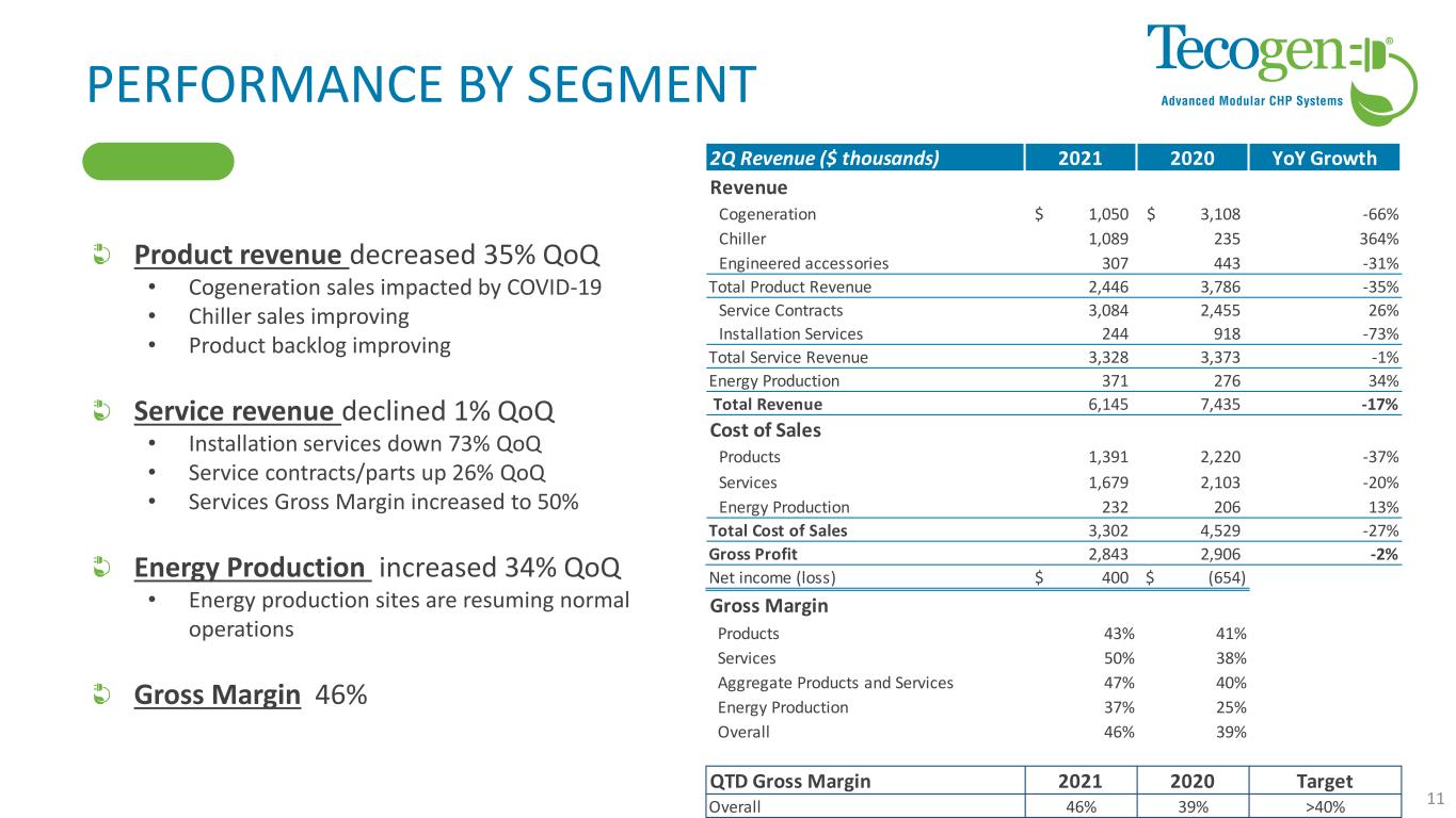 2Q 2021 ADJUSTED EBITDA RECONCILIATION EBITDA: Earnings Before Interest, Taxes, Depreciation & Amortization EBITDA favorably impacted by Employee Retention Credit of $713k EBITDA Non-cash adjustments • Stock based compensation • Unrealized and realized (gain) loss on investment securities *Adjusted EBITDA is defined as net income (loss) attributable to Tecogen Inc, adjusted for interest, depreciation and amortization, stock-based compensation expense, unrealized loss on investment securities, non-cash abandonment of intangible assets, goodwill impairment and other non-recurring charges or gains including abandonment of certain intangible assets and extinguishment of debt 10 Non-GAAP financial disclosure (in thousands) 2Q 2021 2Q 2020 Net income (loss) attributable to Tecogen Inc. 400$ (654)$ Interest expense, net 6 56 Income tax expense 8 13 Depreciation & amortization, net 117 103 EBITDA 531 (481) Stock based compensation 55 39 Unrealized (gain) loss on marketable securities (19) 79 Adjusted EBITDA* 567$ (363)$