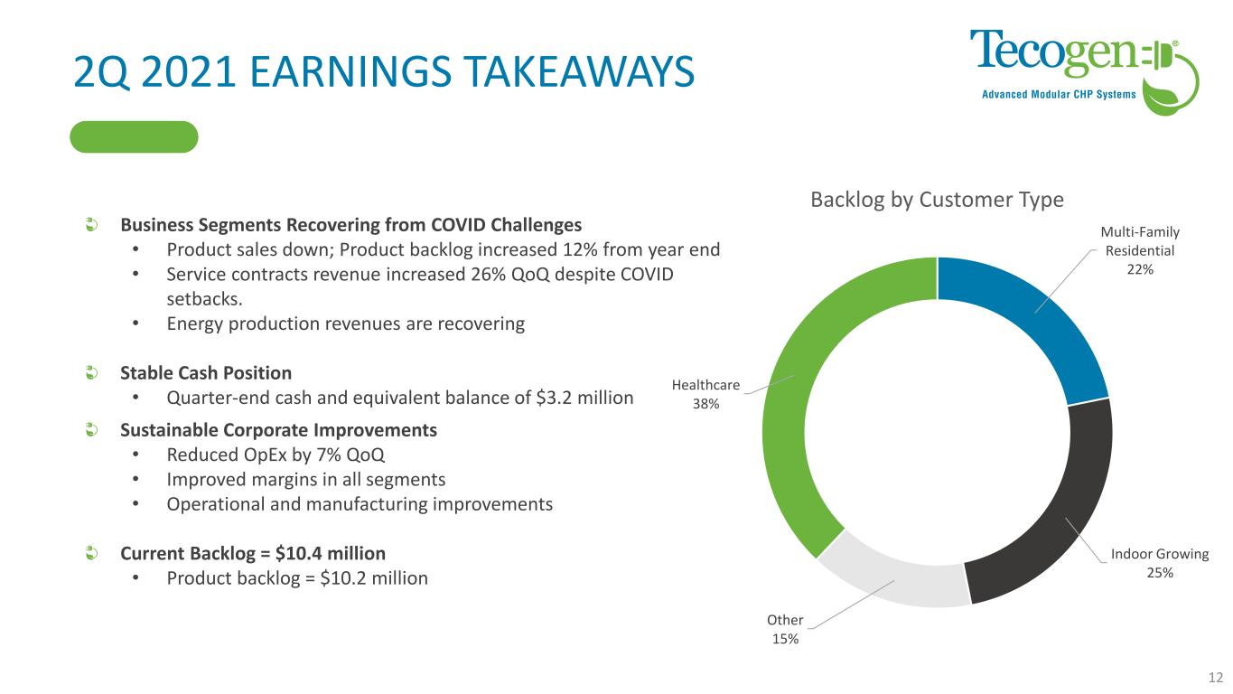 PERFORMANCE BY SEGMENT Product revenue decreased 35% QoQ • Cogeneration sales impacted by COVID-19 • Chiller sales improving • Product backlog improving Service revenue declined 1% QoQ • Installation services down 73% QoQ • Service contracts/parts up 26% QoQ • Services Gross Margin increased to 50% Energy Production increased 34% QoQ • Energy production sites are resuming normal operations Gross Margin 46% 11 2Q Revenue ($ thousands) 2021 2020 YoY Growth Revenue Cogeneration 1,050$ 3,108$ -66% Chiller 1,089 235 364% Engineered accessories 307 443 -31% Total Product Revenue 2,446 3,786 -35% Service Contracts 3,084 2,455 26% Installation Services 244 918 -73% Total Service Revenue 3,328 3,373 -1% Energy Production 371 276 34% Total Revenue 6,145 7,435 -17% Cost of Sales Products 1,391 2,220 -37% Services 1,679 2,103 -20% Energy Production 232 206 13% Total Cost of Sales 3,302 4,529 -27% Gross Profit 2,843 2,906 -2% Net income (loss) 400$ (654)$ Gross Margin Products 43% 41% Services 50% 38% Aggregate Products and Services 47% 40% Energy Production 37% 25% Overall 46% 39% QTD Gross Margin 2021 2020 Target Overall 46% 39% >40%