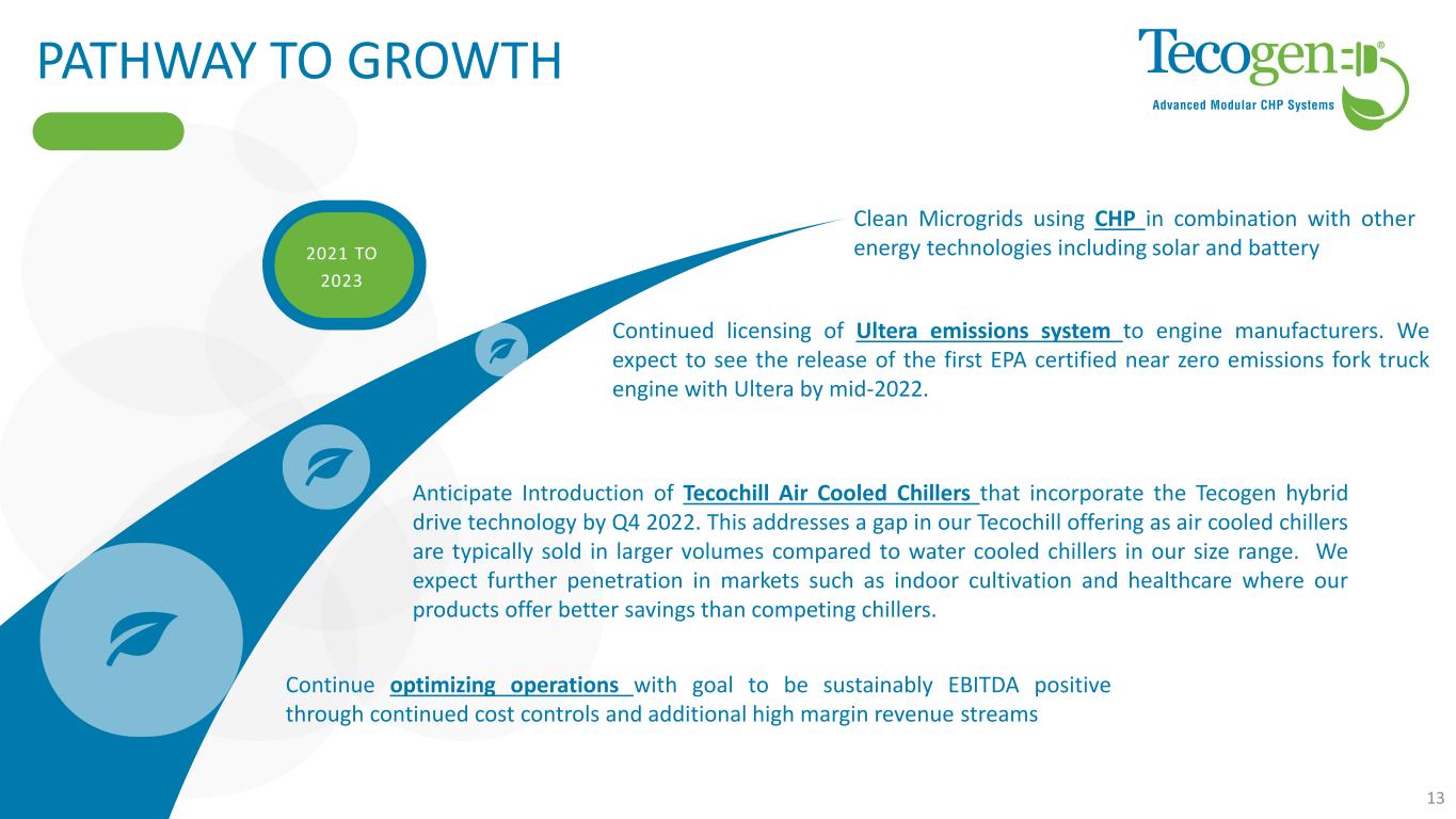 PATHWAY TO GROWTH Continue optimizing operations with goal to be sustainably EBITDA positive through continued cost controls and additional high margin revenue streams Anticipate Introduction of Tecochill Air Cooled Chillers that incorporate the Tecogen hybrid drive technology by Q4 2022. This addresses a gap in our Tecochill offering as air cooled chillers are typically sold in larger volumes compared to water cooled chillers in our size range. We expect further penetration in markets such as indoor cultivation and healthcare where our products offer better savings than competing chillers. Continued licensing of Ultera emissions system to engine manufacturers. We expect to see the release of the first EPA certified near zero emissions fork truck engine with Ultera by mid-2022. Clean Microgrids using CHP in combination with other energy technologies including solar and battery2021 TO 2023 13