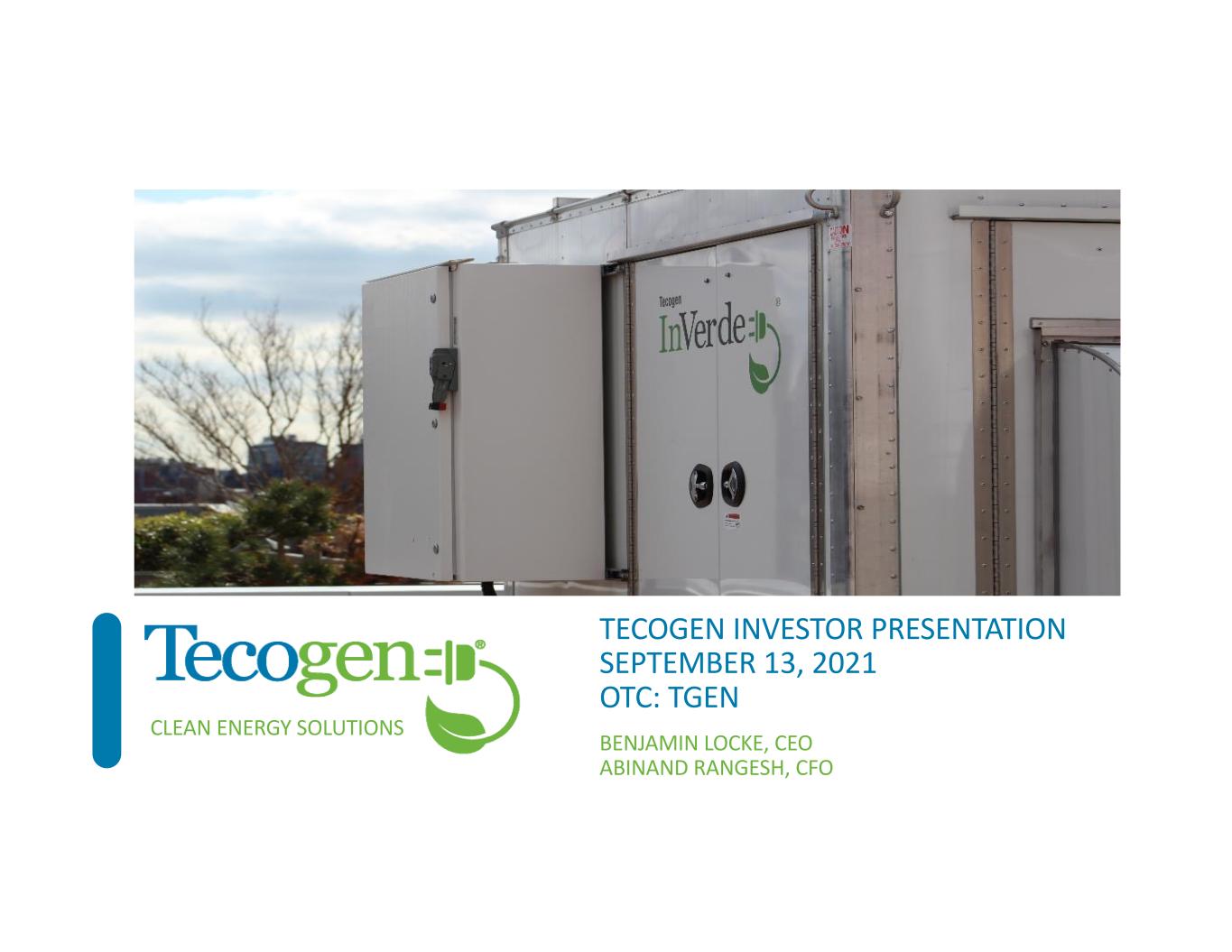 TECOGEN INVESTOR PRESENTATION SEPTEMBER 13, 2021 OTC: TGEN CLEAN ENERGY SOLUTIONS BENJAMIN LOCKE, CEO ABINAND RANGESH, CFO