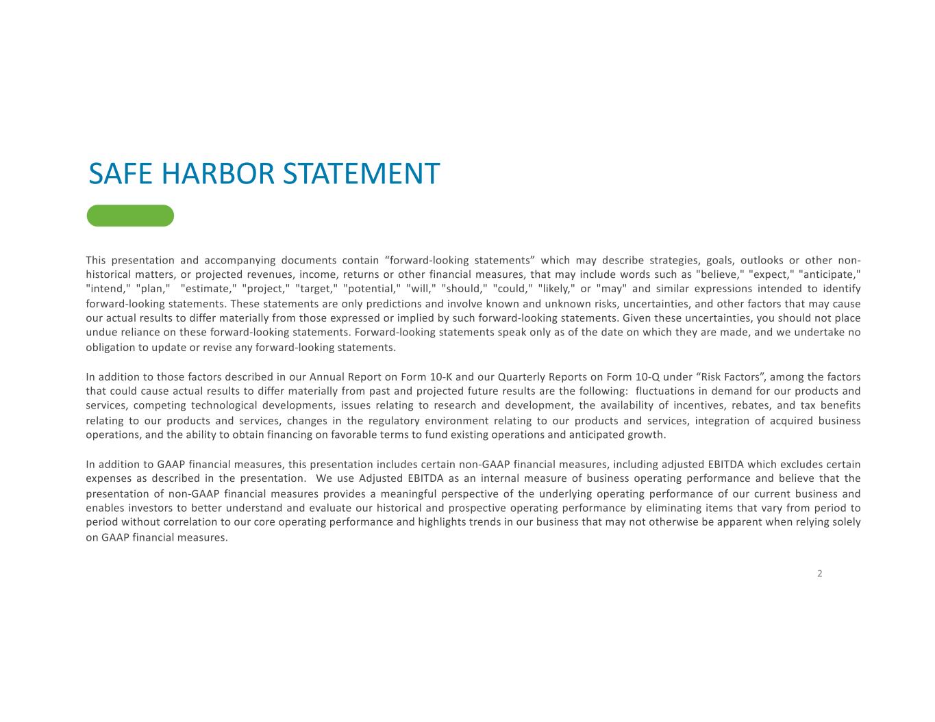 SAFE HARBOR STATEMENT This presentation and accompanying documents contain “forward-looking statements” which may describe strategies, goals, outlooks or other non- historical matters, or projected revenues, income, returns or other financial measures, that may include words such as "believe," "expect," "anticipate," "intend," "plan," "estimate," "project," "target," "potential," "will," "should," "could," "likely," or "may" and similar expressions intended to identify forward-looking statements. These statements are only predictions and involve known and unknown risks, uncertainties, and other factors that may cause our actual results to differ materially from those expressed or implied by such forward-looking statements. Given these uncertainties, you should not place undue reliance on these forward-looking statements. Forward-looking statements speak only as of the date on which they are made, and we undertake no obligation to update or revise any forward-looking statements. In addition to those factors described in our Annual Report on Form 10-K and our Quarterly Reports on Form 10-Q under “Risk Factors”, among the factors that could cause actual results to differ materially from past and projected future results are the following: fluctuations in demand for our products and services, competing technological developments, issues relating to research and development, the availability of incentives, rebates, and tax benefits relating to our products and services, changes in the regulatory environment relating to our products and services, integration of acquired business operations, and the ability to obtain financing on favorable terms to fund existing operations and anticipated growth. In addition to GAAP financial measures, this presentation includes certain non-GAAP financial measures, including adjusted EBITDA which excludes certain expenses as described in the presentation. We use Adjusted EBITDA as an internal measure of business operating performance and believe that the presentation of non-GAAP financial measures provides a meaningful perspective of the underlying operating performance of our current business and enables investors to better understand and evaluate our historical and prospective operating performance by eliminating items that vary from period to period without correlation to our core operating performance and highlights trends in our business that may not otherwise be apparent when relying solely on GAAP financial measures. 2