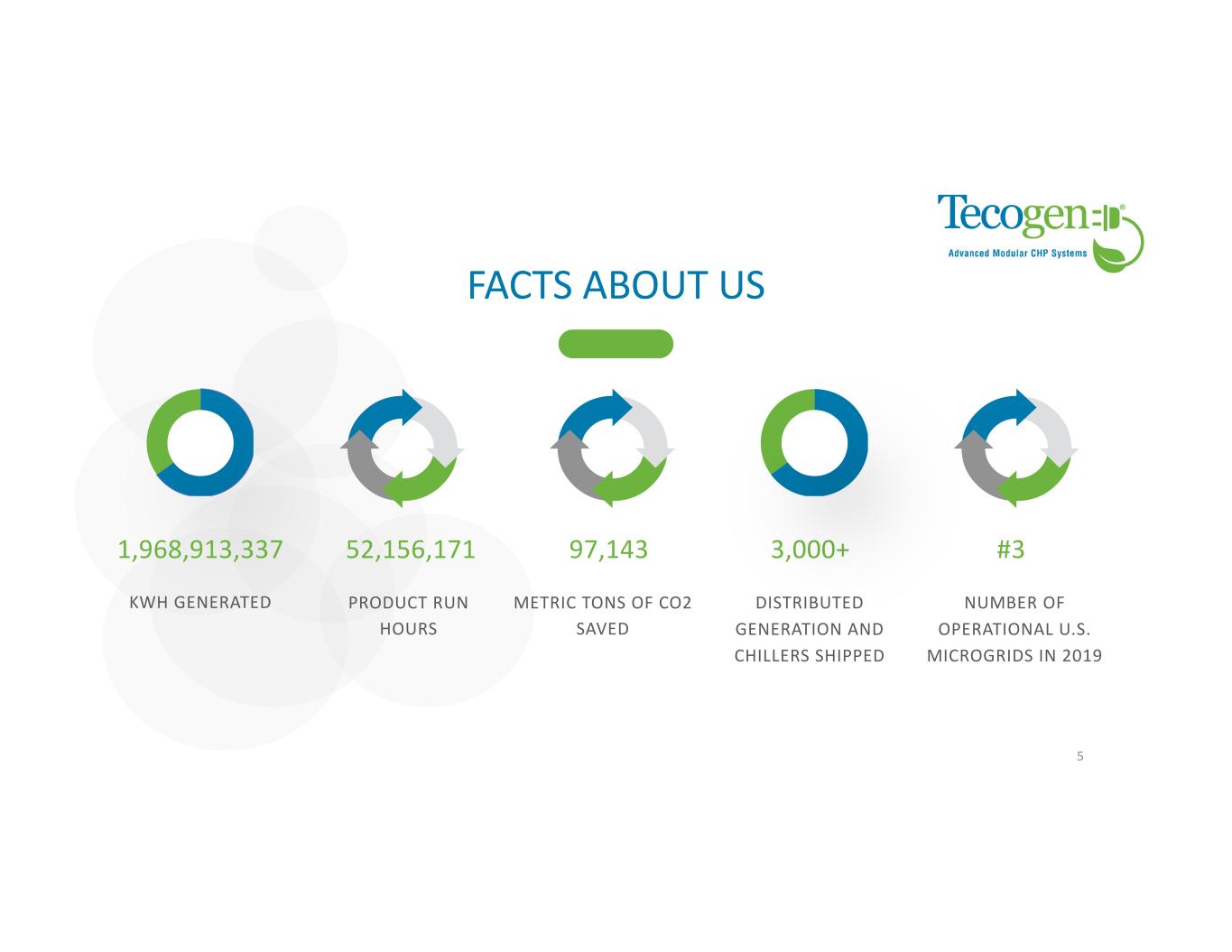 DISTRIBUTED GENERATION AND CHILLERS SHIPPED 3,000+ KWH GENERATED 1,968,913,337 FACTS ABOUT US METRIC TONS OF CO2 SAVED 97,143 PRODUCT RUN HOURS 52,156,171 5 NUMBER OF OPERATIONAL U.S. MICROGRIDS IN 2019 #3
