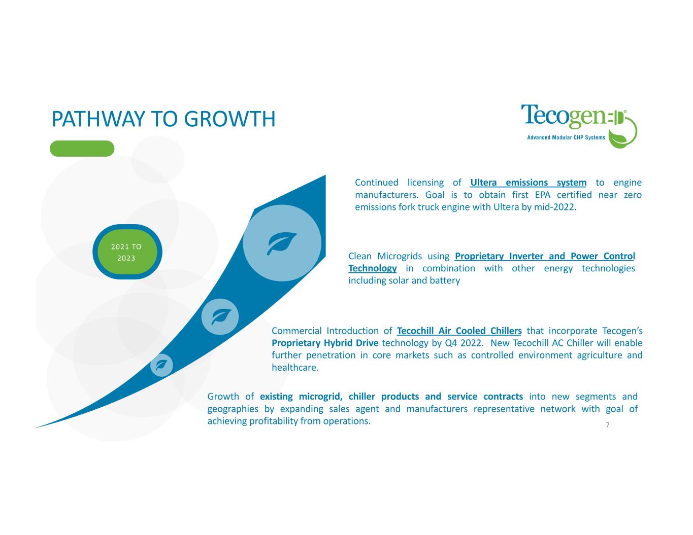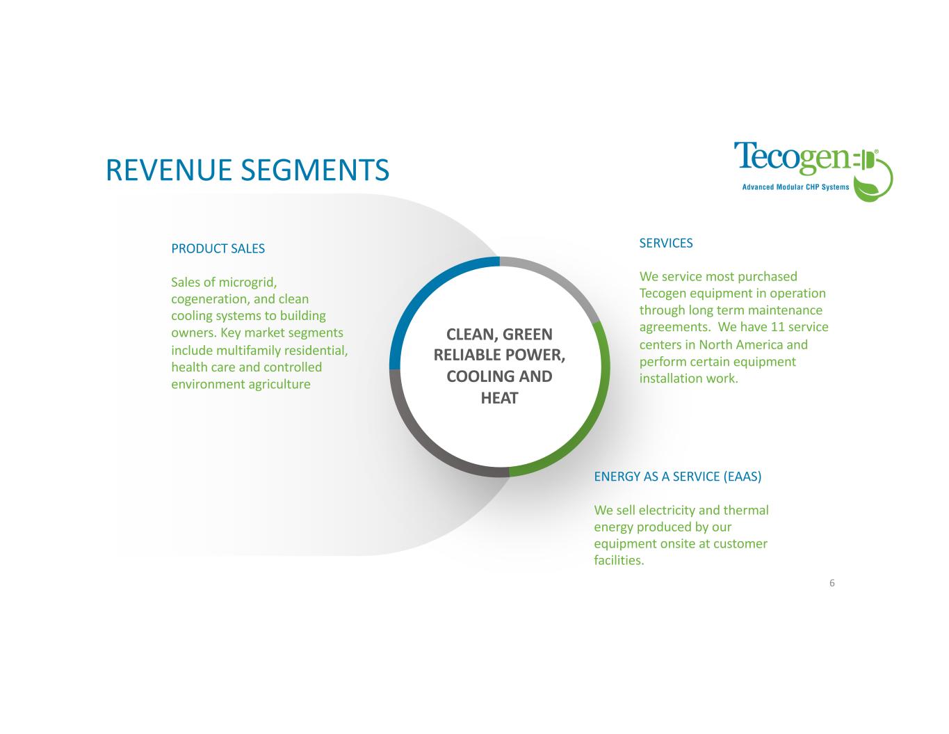 REVENUE SEGMENTS We service most purchased Tecogen equipment in operation through long term maintenance agreements. We have 11 service centers in North America and perform certain equipment installation work. SERVICES CLEAN, GREEN RELIABLE POWER, COOLING AND HEAT Sales of microgrid, cogeneration, and clean cooling systems to building owners. Key market segments include multifamily residential, health care and controlled environment agriculture PRODUCT SALES We sell electricity and thermal energy produced by our equipment onsite at customer facilities. ENERGY AS A SERVICE (EAAS) 6