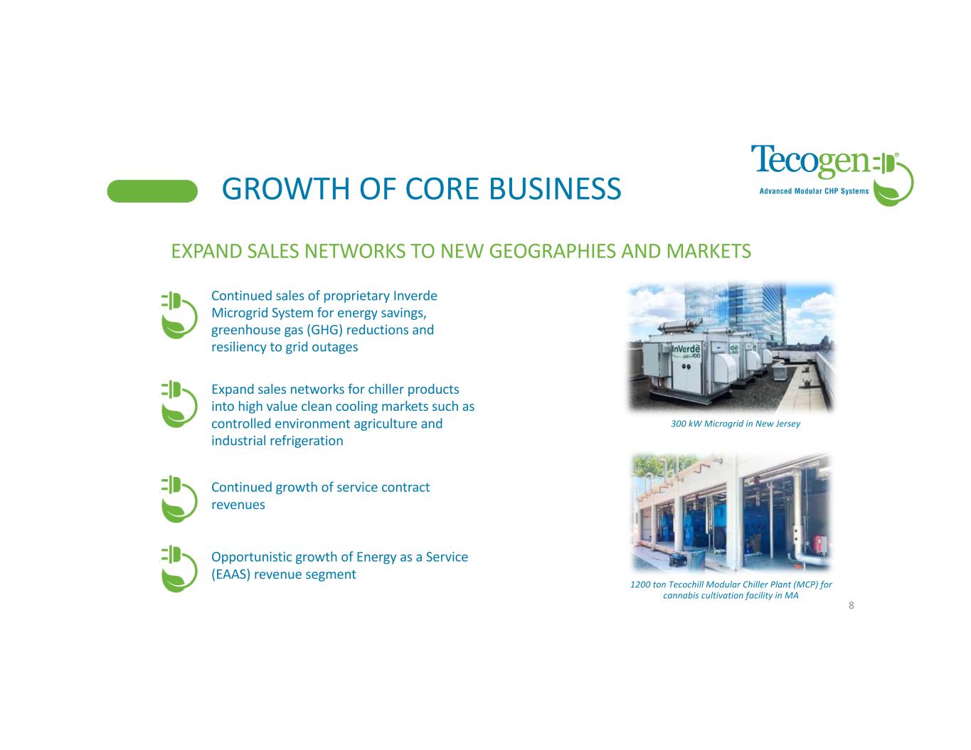 PATHWAY TO GROWTH Commercial Introduction of Tecochill Air Cooled Chillers that incorporate Tecogen’s Proprietary Hybrid Drive technology by Q4 2022. New Tecochill AC Chiller will enable further penetration in core markets such as controlled environment agriculture and healthcare. Continued licensing of Ultera emissions system to engine manufacturers. Goal is to obtain first EPA certified near zero emissions fork truck engine with Ultera by mid-2022. Clean Microgrids using Proprietary Inverter and Power Control Technology in combination with other energy technologies including solar and battery 2021 TO 2023 7 Growth of existing microgrid, chiller products and service contracts into new segments and geographies by expanding sales agent and manufacturers representative network with goal of achieving profitability from operations.