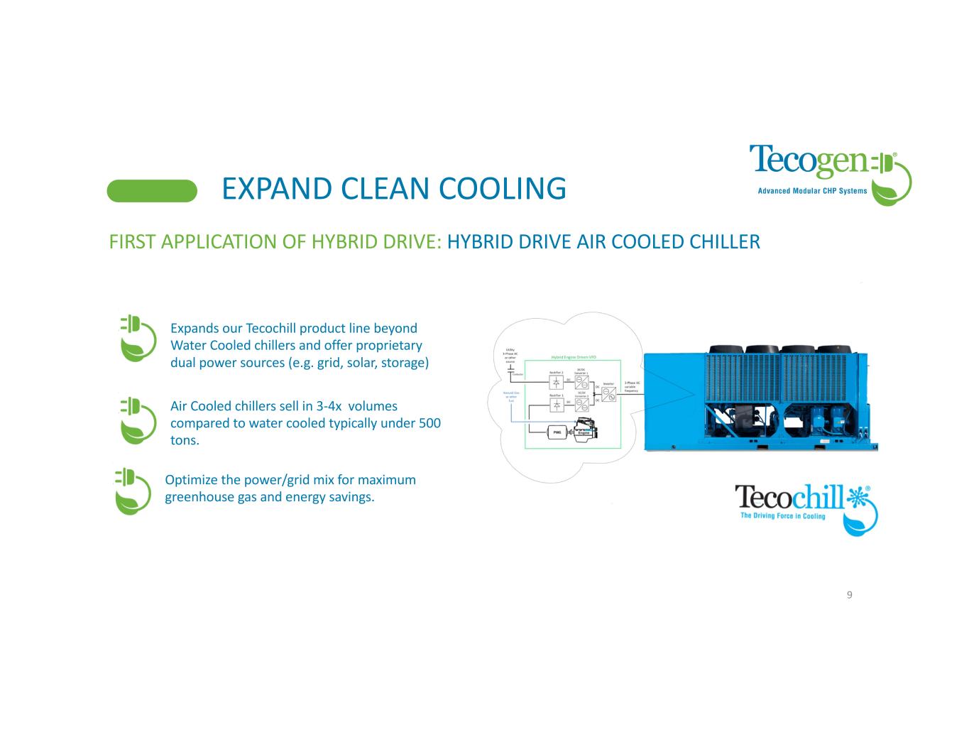 EXPAND SALES NETWORKS TO NEW GEOGRAPHIES AND MARKETS Continued growth of service contract revenues Expand sales networks for chiller products into high value clean cooling markets such as controlled environment agriculture and industrial refrigeration GROWTH OF CORE BUSINESS Continued sales of proprietary Inverde Microgrid System for energy savings, greenhouse gas (GHG) reductions and resiliency to grid outages Opportunistic growth of Energy as a Service (EAAS) revenue segment 1200 ton Tecochill Modular Chiller Plant (MCP) for cannabis cultivation facility in MA 300 kW Microgrid in New Jersey 8