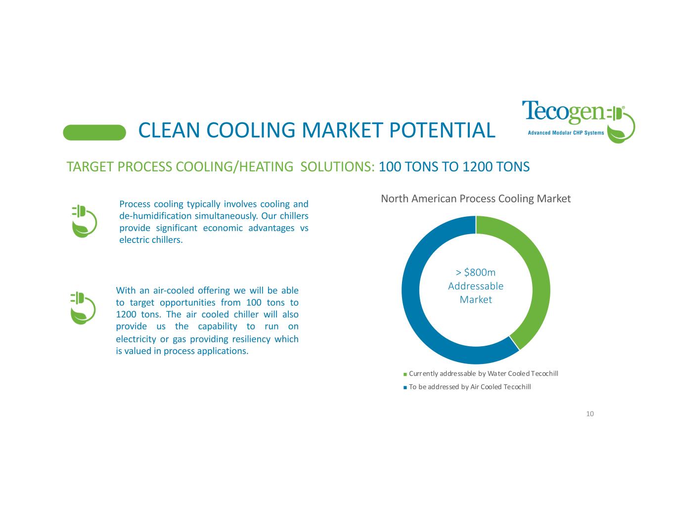 FIRST APPLICATION OF HYBRID DRIVE: HYBRID DRIVE AIR COOLED CHILLER Optimize the power/grid mix for maximum greenhouse gas and energy savings. Air Cooled chillers sell in 3-4x volumes compared to water cooled typically under 500 tons. EXPAND CLEAN COOLING 9 Expands our Tecochill product line beyond Water Cooled chillers and offer proprietary dual power sources (e.g. grid, solar, storage)