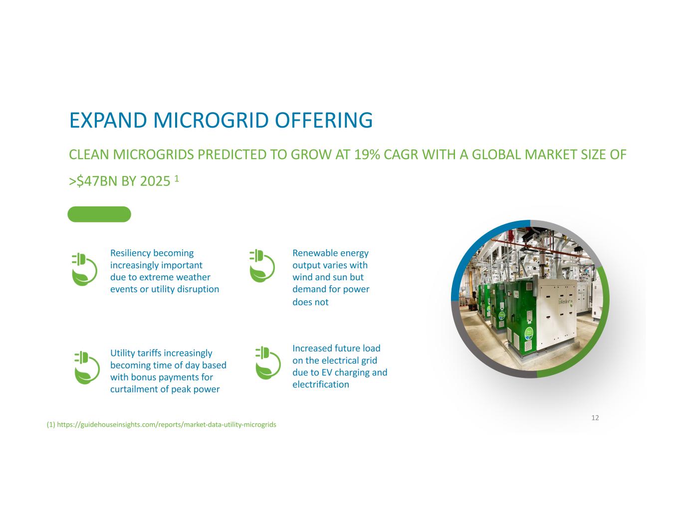 EXPAND MICROGRID OFFERING CLEAN MICROGRIDS PREDICTED TO GROW AT 19% CAGR WITH A GLOBAL MARKET SIZE OF >$47BN BY 2025 1 Increased future load on the electrical grid due to EV charging and electrification Utility tariffs increasingly becoming time of day based with bonus payments for curtailment of peak power Renewable energy output varies with wind and sun but demand for power does not Resiliency becoming increasingly important due to extreme weather events or utility disruption (1) https://guidehouseinsights.com/reports/market-data-utility-microgrids 12