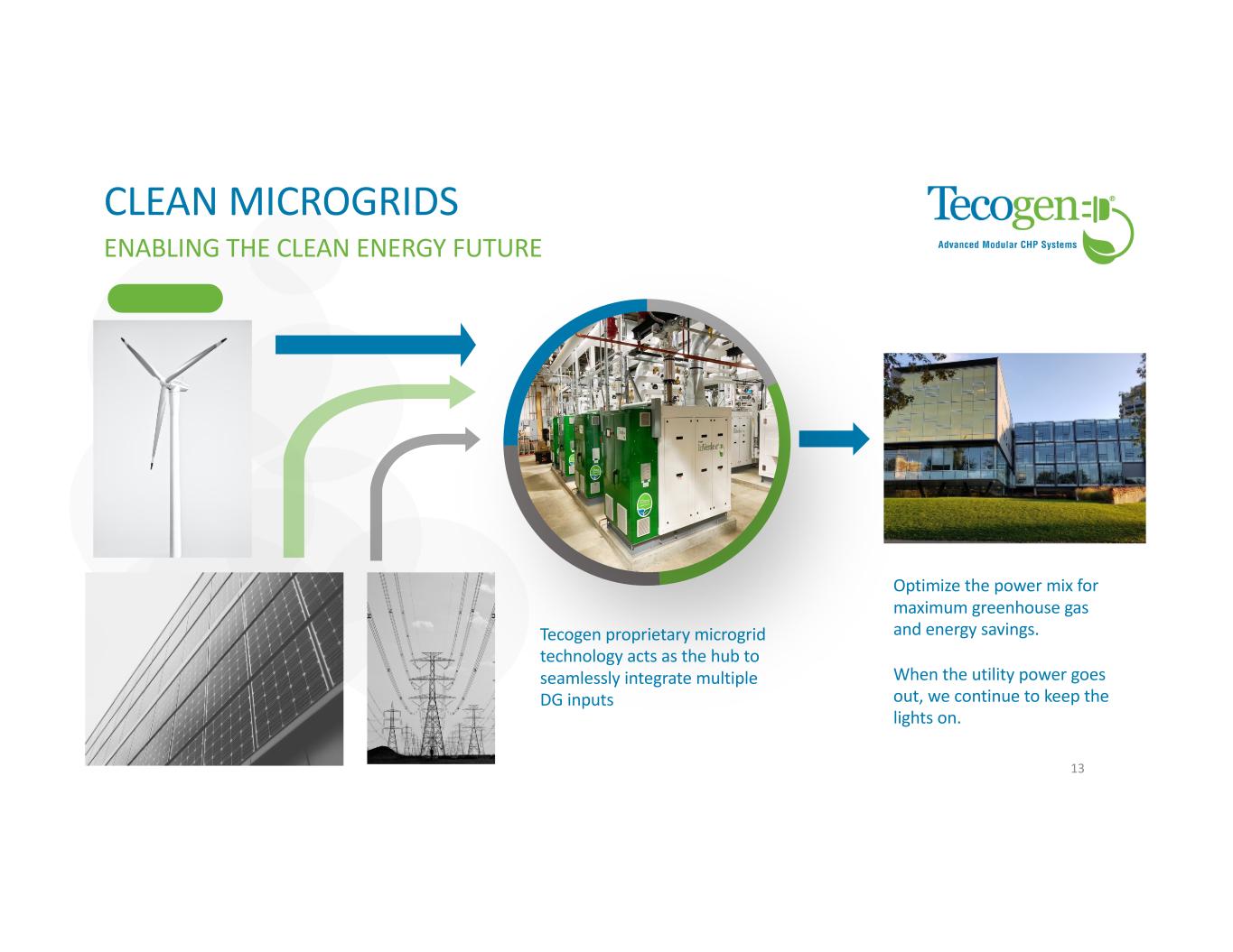 CLEAN MICROGRIDS ENABLING THE CLEAN ENERGY FUTURE 13 Tecogen proprietary microgrid technology acts as the hub to seamlessly integrate multiple DG inputs Optimize the power mix for maximum greenhouse gas and energy savings. When the utility power goes out, we continue to keep the lights on.