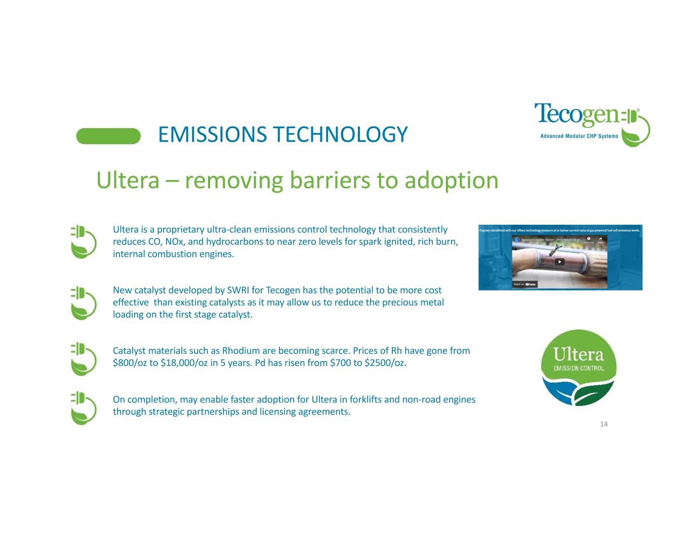 EMISSIONS TECHNOLOGY On completion, may enable faster adoption for Ultera in forklifts and non-road engines through strategic partnerships and licensing agreements. Ultera – removing barriers to adoption Catalyst materials such as Rhodium are becoming scarce. Prices of Rh have gone from $800/oz to $18,000/oz in 5 years. Pd has risen from $700 to $2500/oz. 14 Ultera is a proprietary ultra-clean emissions control technology that consistently reduces CO, NOx, and hydrocarbons to near zero levels for spark ignited, rich burn, internal combustion engines. New catalyst developed by SWRI for Tecogen has the potential to be more cost effective than existing catalysts as it may allow us to reduce the precious metal loading on the first stage catalyst.