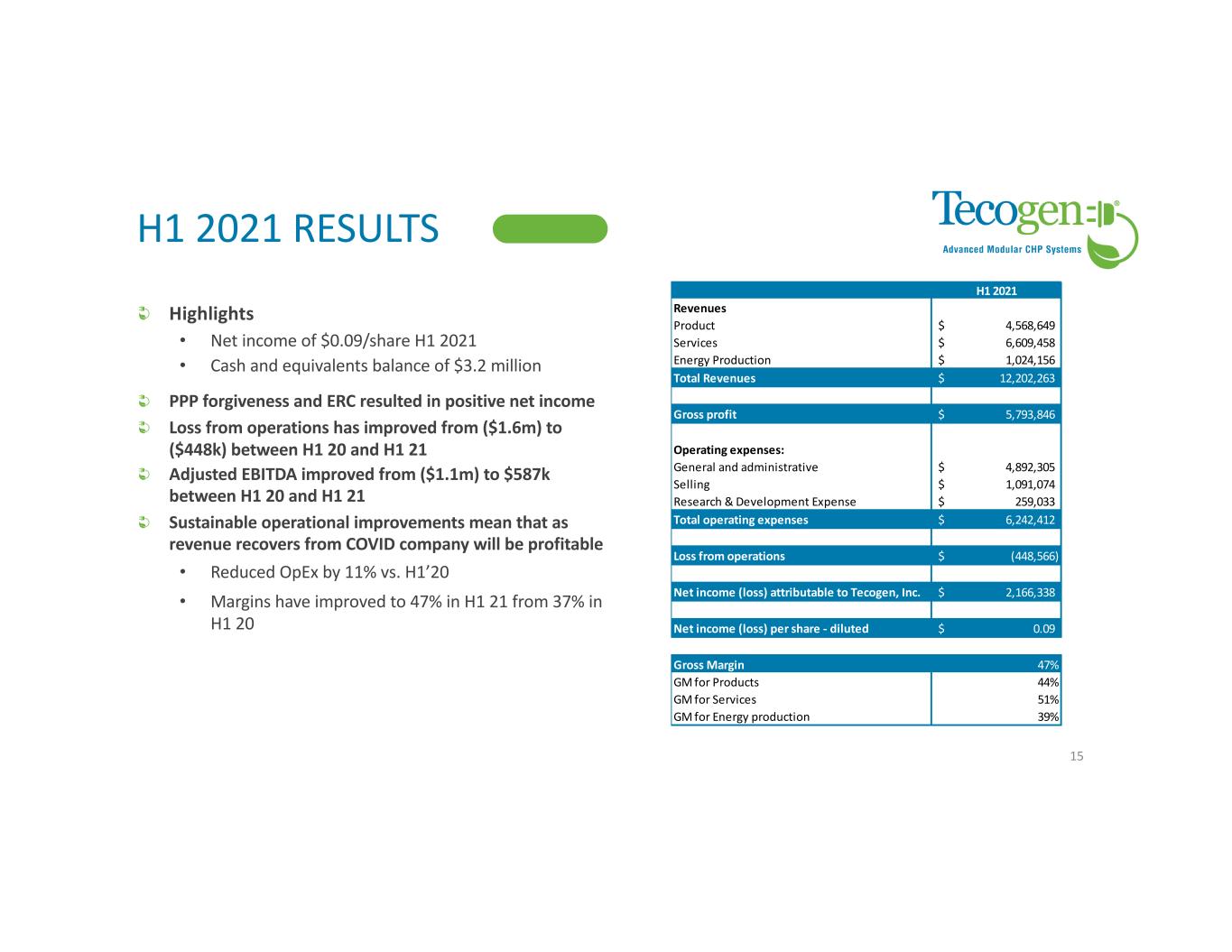 H1 2021 RESULTS Highlights • Net income of $0.09/share H1 2021 • Cash and equivalents balance of $3.2 million PPP forgiveness and ERC resulted in positive net income Loss from operations has improved from ($1.6m) to ($448k) between H1 20 and H1 21 Adjusted EBITDA improved from ($1.1m) to $587k between H1 20 and H1 21 Sustainable operational improvements mean that as revenue recovers from COVID company will be profitable • Reduced OpEx by 11% vs. H1’20 • Margins have improved to 47% in H1 21 from 37% in H1 20 15 H1 2021 Revenues Product 4,568,649$ Services 6,609,458$ Energy Production 1,024,156$ Total Revenues 12,202,263$ Gross profit 5,793,846$ Operating expenses: General and administrative 4,892,305$ Selling 1,091,074$ Research & Development Expense 259,033$ Total operating expenses 6,242,412$ Loss from operations (448,566)$ Net income (loss) attributable to Tecogen, Inc. 2,166,338$ Net income (loss) per share - diluted 0.09$ Gross Margin 47% GM for Products 44% GM for Services 51% GM for Energy production 39%