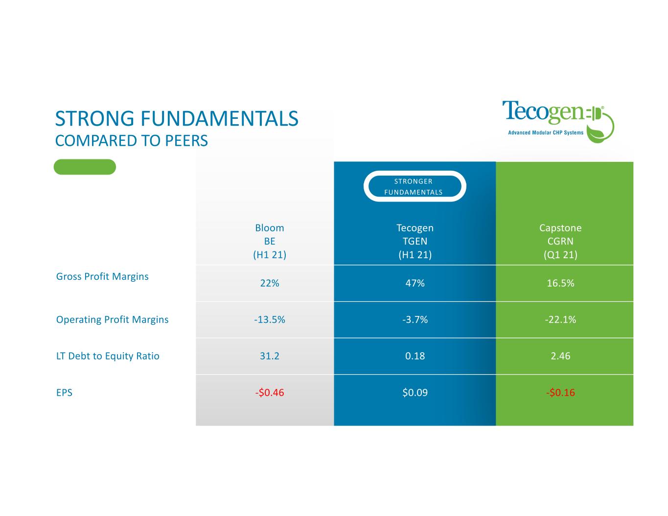 STRONGER FUNDAMENTALS Bloom BE (H1 21) Tecogen TGEN (H1 21) Capstone CGRN (Q1 21) Gross Profit Margins 22% 47% 16.5% Operating Profit Margins -13.5% -3.7% -22.1% LT Debt to Equity Ratio 31.2 0.18 2.46 EPS -$0.46 $0.09 -$0.16 STRONG FUNDAMENTALS COMPARED TO PEERS