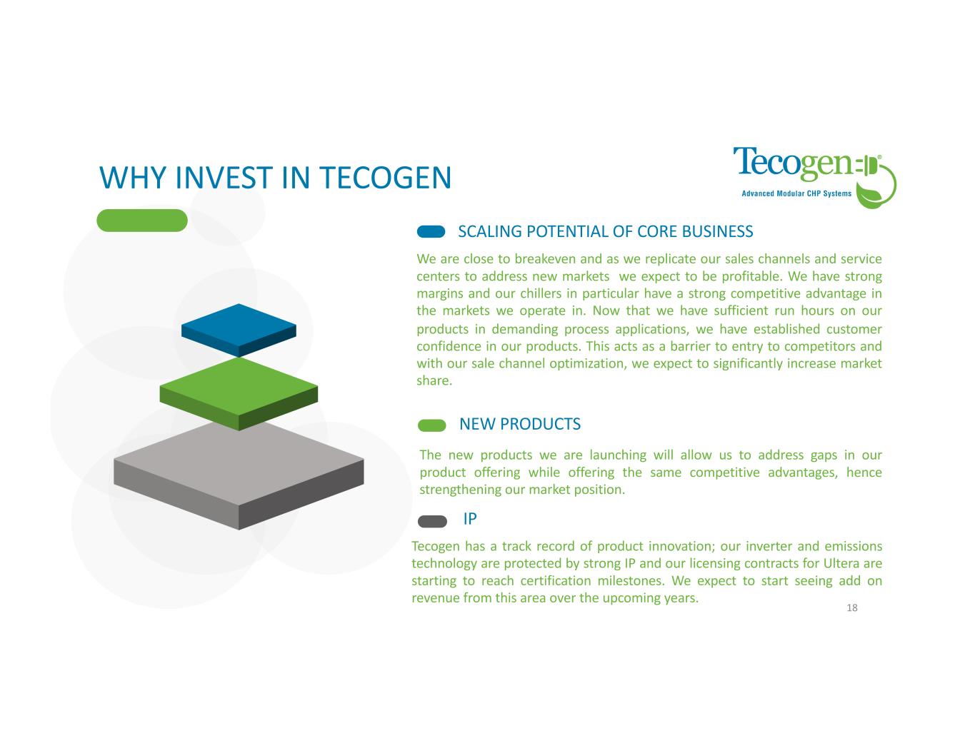 WHY INVEST IN TECOGEN The new products we are launching will allow us to address gaps in our product offering while offering the same competitive advantages, hence strengthening our market position. We are close to breakeven and as we replicate our sales channels and service centers to address new markets we expect to be profitable. We have strong margins and our chillers in particular have a strong competitive advantage in the markets we operate in. Now that we have sufficient run hours on our products in demanding process applications, we have established customer confidence in our products. This acts as a barrier to entry to competitors and with our sale channel optimization, we expect to significantly increase market share. SCALING POTENTIAL OF CORE BUSINESS NEW PRODUCTS IP Tecogen has a track record of product innovation; our inverter and emissions technology are protected by strong IP and our licensing contracts for Ultera are starting to reach certification milestones. We expect to start seeing add on revenue from this area over the upcoming years. 18