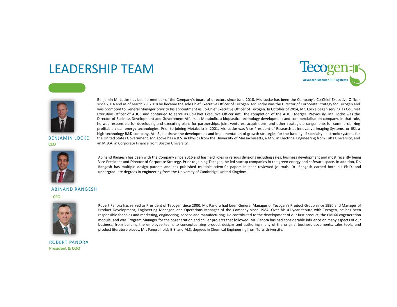 LEADERSHIP TEAM CEO BENJAMIN LOCKE Benjamin M. Locke has been a member of the Company's board of directors since June 2018. Mr. Locke has been the Company's Co-Chief Executive Officer since 2014 and as of March 29, 2018 he became the sole Chief Executive Officer of Tecogen. Mr. Locke was the Director of Corporate Strategy for Tecogen and was promoted to General Manager prior to his appointment as Co-Chief Executive Officer of Tecogen. In October of 2014, Mr. Locke began serving as Co-Chief Executive Officer of ADGE and continued to serve as Co-Chief Executive Officer until the completion of the ADGE Merger. Previously, Mr. Locke was the Director of Business Development and Government Affairs at Metabolix, a bioplastics technology development and commercialization company. In that role, he was responsible for developing and executing plans for partnerships, joint ventures, acquisitions, and other strategic arrangements for commercializing profitable clean energy technologies. Prior to joining Metabolix in 2001, Mr. Locke was Vice President of Research at Innovative Imaging Systems, or IISI, a high-technology R&D company. At IISI, he drove the development and implementation of growth strategies for the funding of specialty electronic systems for the United States Government. Mr. Locke has a B.S. in Physics from the University of Massachusetts, a M.S. in Electrical Engineering from Tufts University, and an M.B.A. in Corporate Finance from Boston University. Abinand Rangesh has been with the Company since 2016 and has held roles in various divisions including sales, business development and most recently being Vice President and Director of Corporate Strategy. Prior to joining Tecogen, he led startup companies in the green energy and software space. In addition, Dr. Rangesh has multiple design patents and has published multiple scientific papers in peer reviewed journals. Dr. Rangesh earned both his Ph.D. and undergraduate degrees in engineering from the University of Cambridge, United Kingdom. CFO ABINAND RANGESH President & COO ROBERT PANORA Robert Panora has served as President of Tecogen since 2000. Mr. Panora had been General Manager of Tecogen’s Product Group since 1990 and Manager of Product Development, Engineering Manager, and Operations Manager of the Company since 1984. Over his 41-year tenure with Tecogen, he has been responsible for sales and marketing, engineering, service and manufacturing. He contributed to the development of our first product, the CM-60 cogeneration module, and was Program Manager for the cogeneration and chiller projects that followed. Mr. Panora has had considerable influence on many aspects of our business, from building the employee team, to conceptualizing product designs and authoring many of the original business documents, sales tools, and product literature pieces. Mr. Panora holds B.S. and M.S. degrees in Chemical Engineering from Tufts University.