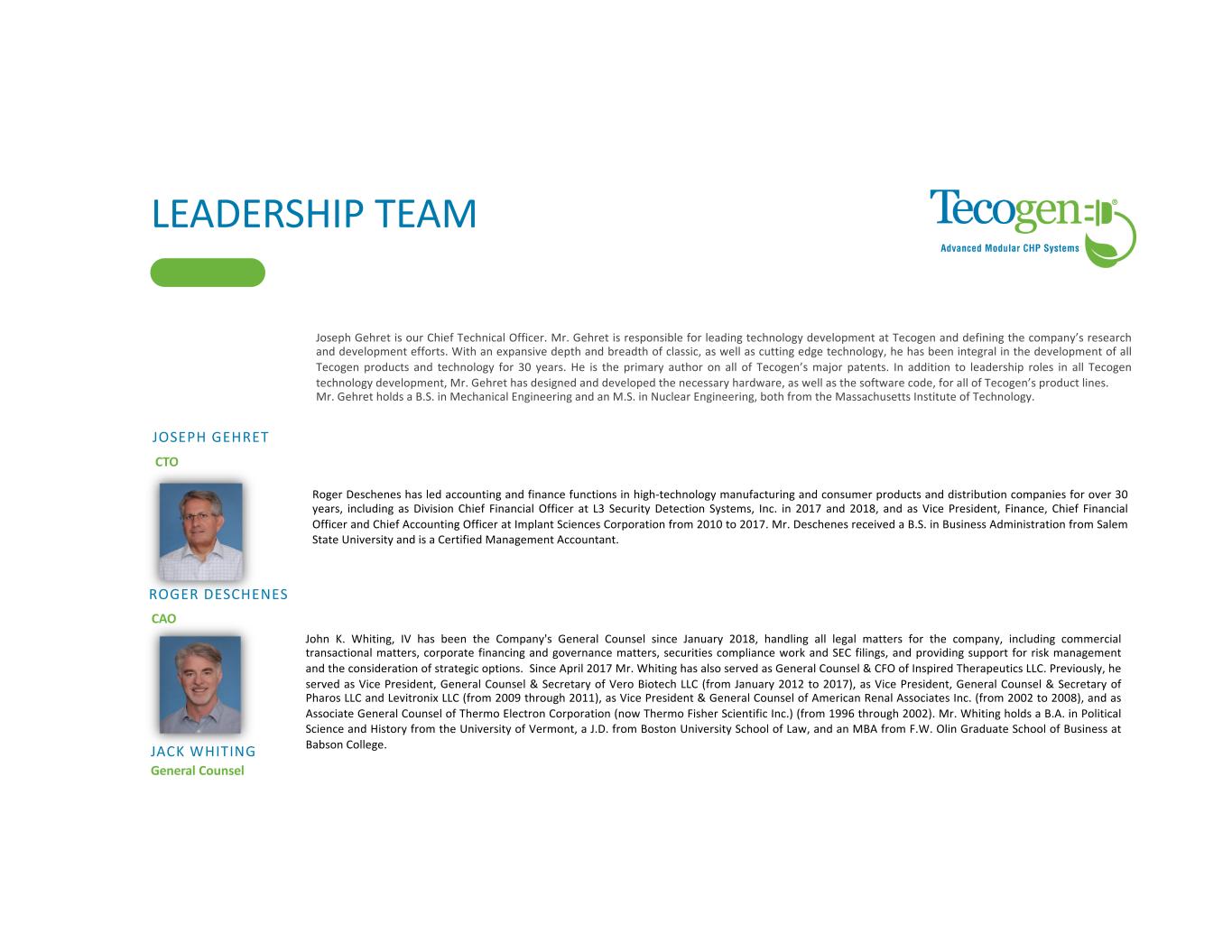 LEADERSHIP TEAM Roger Deschenes has led accounting and finance functions in high-technology manufacturing and consumer products and distribution companies for over 30 years, including as Division Chief Financial Officer at L3 Security Detection Systems, Inc. in 2017 and 2018, and as Vice President, Finance, Chief Financial Officer and Chief Accounting Officer at Implant Sciences Corporation from 2010 to 2017. Mr. Deschenes received a B.S. in Business Administration from Salem State University and is a Certified Management Accountant. CAO ROGER DESCHENES General Counsel JACK WHITING John K. Whiting, IV has been the Company's General Counsel since January 2018, handling all legal matters for the company, including commercial transactional matters, corporate financing and governance matters, securities compliance work and SEC filings, and providing support for risk management and the consideration of strategic options. Since April 2017 Mr. Whiting has also served as General Counsel & CFO of Inspired Therapeutics LLC. Previously, he served as Vice President, General Counsel & Secretary of Vero Biotech LLC (from January 2012 to 2017), as Vice President, General Counsel & Secretary of Pharos LLC and Levitronix LLC (from 2009 through 2011), as Vice President & General Counsel of American Renal Associates Inc. (from 2002 to 2008), and as Associate General Counsel of Thermo Electron Corporation (now Thermo Fisher Scientific Inc.) (from 1996 through 2002). Mr. Whiting holds a B.A. in Political Science and History from the University of Vermont, a J.D. from Boston University School of Law, and an MBA from F.W. Olin Graduate School of Business at Babson College. Joseph Gehret is our Chief Technical Officer. Mr. Gehret is responsible for leading technology development at Tecogen and defining the company’s research and development efforts. With an expansive depth and breadth of classic, as well as cutting edge technology, he has been integral in the development of all Tecogen products and technology for 30 years. He is the primary author on all of Tecogen’s major patents. In addition to leadership roles in all Tecogen technology development, Mr. Gehret has designed and developed the necessary hardware, as well as the software code, for all of Tecogen’s product lines. Mr. Gehret holds a B.S. in Mechanical Engineering and an M.S. in Nuclear Engineering, both from the Massachusetts Institute of Technology. CTO JOSEPH GEHRET