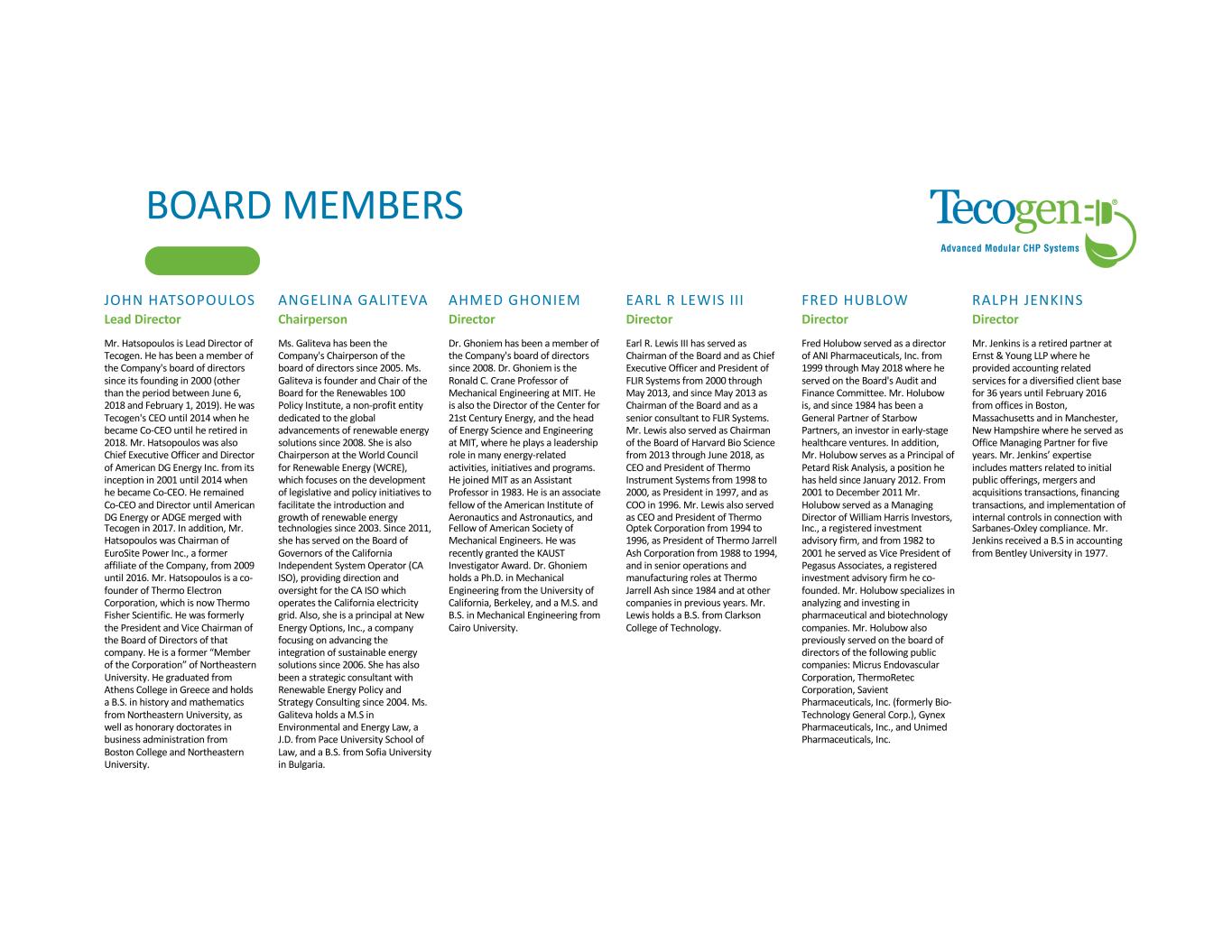BOARD MEMBERS Director Earl R. Lewis III has served as Chairman of the Board and as Chief Executive Officer and President of FLIR Systems from 2000 through May 2013, and since May 2013 as Chairman of the Board and as a senior consultant to FLIR Systems. Mr. Lewis also served as Chairman of the Board of Harvard Bio Science from 2013 through June 2018, as CEO and President of Thermo Instrument Systems from 1998 to 2000, as President in 1997, and as COO in 1996. Mr. Lewis also served as CEO and President of Thermo Optek Corporation from 1994 to 1996, as President of Thermo Jarrell Ash Corporation from 1988 to 1994, and in senior operations and manufacturing roles at Thermo Jarrell Ash since 1984 and at other companies in previous years. Mr. Lewis holds a B.S. from Clarkson College of Technology. EARL R LEWIS III Lead Director Mr. Hatsopoulos is Lead Director of Tecogen. He has been a member of the Company's board of directors since its founding in 2000 (other than the period between June 6, 2018 and February 1, 2019). He was Tecogen's CEO until 2014 when he became Co-CEO until he retired in 2018. Mr. Hatsopoulos was also Chief Executive Officer and Director of American DG Energy Inc. from its inception in 2001 until 2014 when he became Co-CEO. He remained Co-CEO and Director until American DG Energy or ADGE merged with Tecogen in 2017. In addition, Mr. Hatsopoulos was Chairman of EuroSite Power Inc., a former affiliate of the Company, from 2009 until 2016. Mr. Hatsopoulos is a co- founder of Thermo Electron Corporation, which is now Thermo Fisher Scientific. He was formerly the President and Vice Chairman of the Board of Directors of that company. He is a former “Member of the Corporation” of Northeastern University. He graduated from Athens College in Greece and holds a B.S. in history and mathematics from Northeastern University, as well as honorary doctorates in business administration from Boston College and Northeastern University. JOHN HATSOPOULOS Director Dr. Ghoniem has been a member of the Company's board of directors since 2008. Dr. Ghoniem is the Ronald C. Crane Professor of Mechanical Engineering at MIT. He is also the Director of the Center for 21st Century Energy, and the head of Energy Science and Engineering at MIT, where he plays a leadership role in many energy-related activities, initiatives and programs. He joined MIT as an Assistant Professor in 1983. He is an associate fellow of the American Institute of Aeronautics and Astronautics, and Fellow of American Society of Mechanical Engineers. He was recently granted the KAUST Investigator Award. Dr. Ghoniem holds a Ph.D. in Mechanical Engineering from the University of California, Berkeley, and a M.S. and B.S. in Mechanical Engineering from Cairo University. AHMED GHONIEM Chairperson Ms. Galiteva has been the Company's Chairperson of the board of directors since 2005. Ms. Galiteva is founder and Chair of the Board for the Renewables 100 Policy Institute, a non-profit entity dedicated to the global advancements of renewable energy solutions since 2008. She is also Chairperson at the World Council for Renewable Energy (WCRE), which focuses on the development of legislative and policy initiatives to facilitate the introduction and growth of renewable energy technologies since 2003. Since 2011, she has served on the Board of Governors of the California Independent System Operator (CA ISO), providing direction and oversight for the CA ISO which operates the California electricity grid. Also, she is a principal at New Energy Options, Inc., a company focusing on advancing the integration of sustainable energy solutions since 2006. She has also been a strategic consultant with Renewable Energy Policy and Strategy Consulting since 2004. Ms. Galiteva holds a M.S in Environmental and Energy Law, a J.D. from Pace University School of Law, and a B.S. from Sofia University in Bulgaria. ANGELINA GALITEVA Director Fred Holubow served as a director of ANI Pharmaceuticals, Inc. from 1999 through May 2018 where he served on the Board's Audit and Finance Committee. Mr. Holubow is, and since 1984 has been a General Partner of Starbow Partners, an investor in early-stage healthcare ventures. In addition, Mr. Holubow serves as a Principal of Petard Risk Analysis, a position he has held since January 2012. From 2001 to December 2011 Mr. Holubow served as a Managing Director of William Harris Investors, Inc., a registered investment advisory firm, and from 1982 to 2001 he served as Vice President of Pegasus Associates, a registered investment advisory firm he co- founded. Mr. Holubow specializes in analyzing and investing in pharmaceutical and biotechnology companies. Mr. Holubow also previously served on the board of directors of the following public companies: Micrus Endovascular Corporation, ThermoRetec Corporation, Savient Pharmaceuticals, Inc. (formerly Bio- Technology General Corp.), Gynex Pharmaceuticals, Inc., and Unimed Pharmaceuticals, Inc. FRED HUBLOW Director Mr. Jenkins is a retired partner at Ernst & Young LLP where he provided accounting related services for a diversified client base for 36 years until February 2016 from offices in Boston, Massachusetts and in Manchester, New Hampshire where he served as Office Managing Partner for five years. Mr. Jenkins’ expertise includes matters related to initial public offerings, mergers and acquisitions transactions, financing transactions, and implementation of internal controls in connection with Sarbanes-Oxley compliance. Mr. Jenkins received a B.S in accounting from Bentley University in 1977. RALPH JENKINS