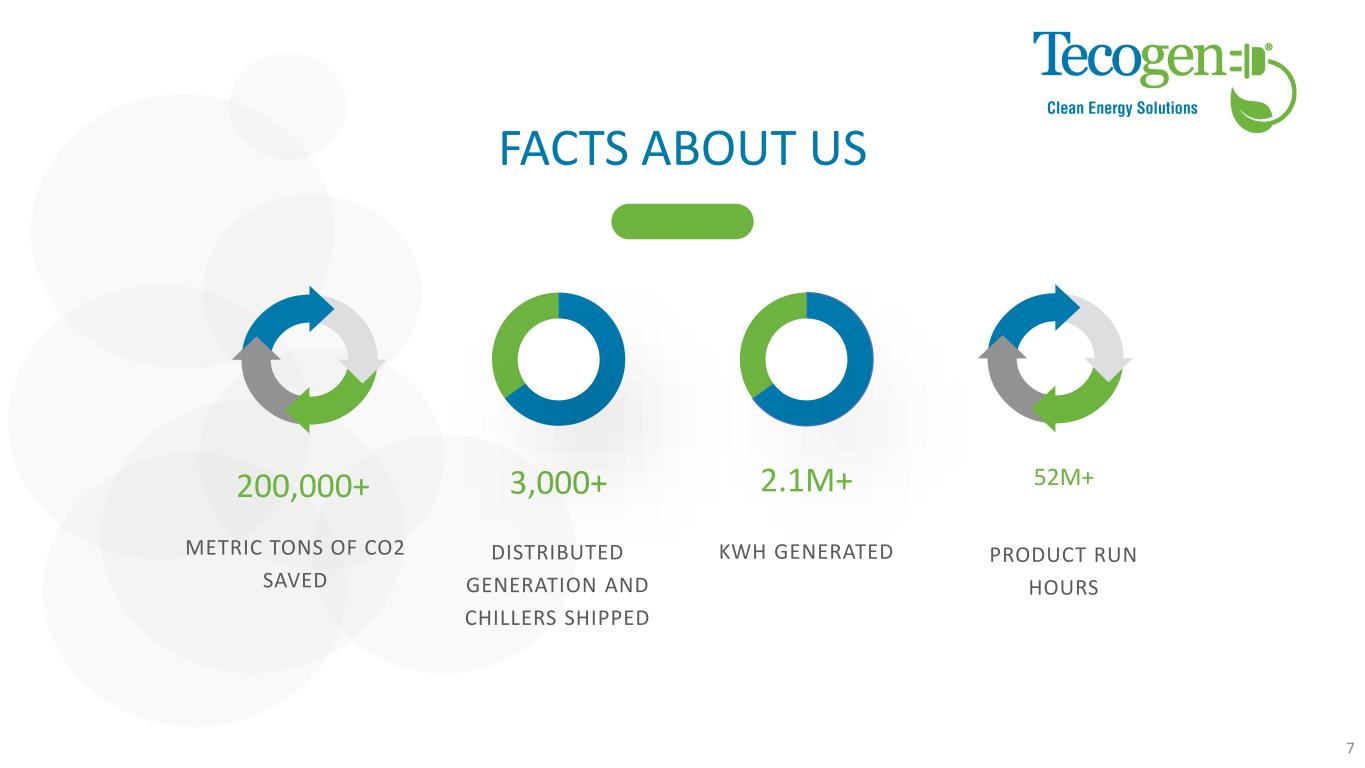 DISTRIBUTED GENERATION CLEAN COOLING Chillers with lower operating cost and lower greenhouse gas footprint compared to an equivalent electric chiller EMISSIONS 3rd in number of microgrids installed in North America Near zero NOx and CO emissions systems for gasoline, propane and natural gas engines 6