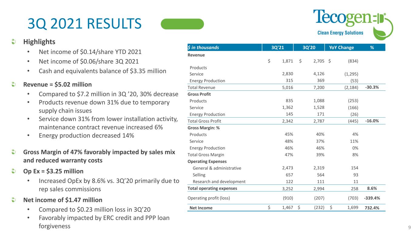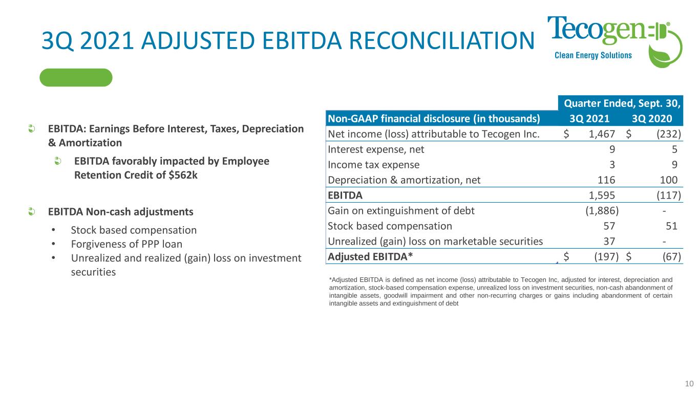 3Q 2021 RESULTS Highlights • Net income of $0.14/share YTD 2021 • Net income of $0.06/share 3Q 2021 • Cash and equivalents balance of $3.35 million Revenue = $5.02 million • Compared to $7.2 million in 3Q ’20, 30% decrease • Products revenue down 31% due to temporary supply chain issues • Service down 31% from lower installation activity, maintenance contract revenue increased 6% • Energy production decreased 14% Gross Margin of 47% favorably impacted by sales mix and reduced warranty costs Op Ex = $3.25 million • Increased OpEx by 8.6% vs. 3Q’20 primarily due to rep sales commissions Net income of $1.47 million • Compared to $0.23 million loss in 3Q’20 • Favorably impacted by ERC credit and PPP loan forgiveness 9 $ in thousands 3Q'21 3Q'20 YoY Change % Revenue Products $ 1,871 $ 2,705 $ (834) Service 2,830 4,126 (1,295) Energy Production 315 369 (53) Total Revenue 5,016 7,200 (2,184) -30.3% Gross Profit Products 835 1,088 (253) Service 1,362 1,528 (166) Energy Production 145 171 (26) Total Gross Profit 2,342 2,787 (445) -16.0% Gross Margin: % Products 45% 40% 4% Service 48% 37% 11% Energy Production 46% 46% 0% Total Gross Margin 47% 39% 8% Operating Expenses General & administrative 2,473 2,319 154 Selling 657 564 93 Research and development 122 111 11 Total operating expenses 3,252 2,994 258 8.6% Operating profit (loss) (910) (207) (703) -339.4% Net Income $ 1,467 $ (232) $ 1,699 732.4%