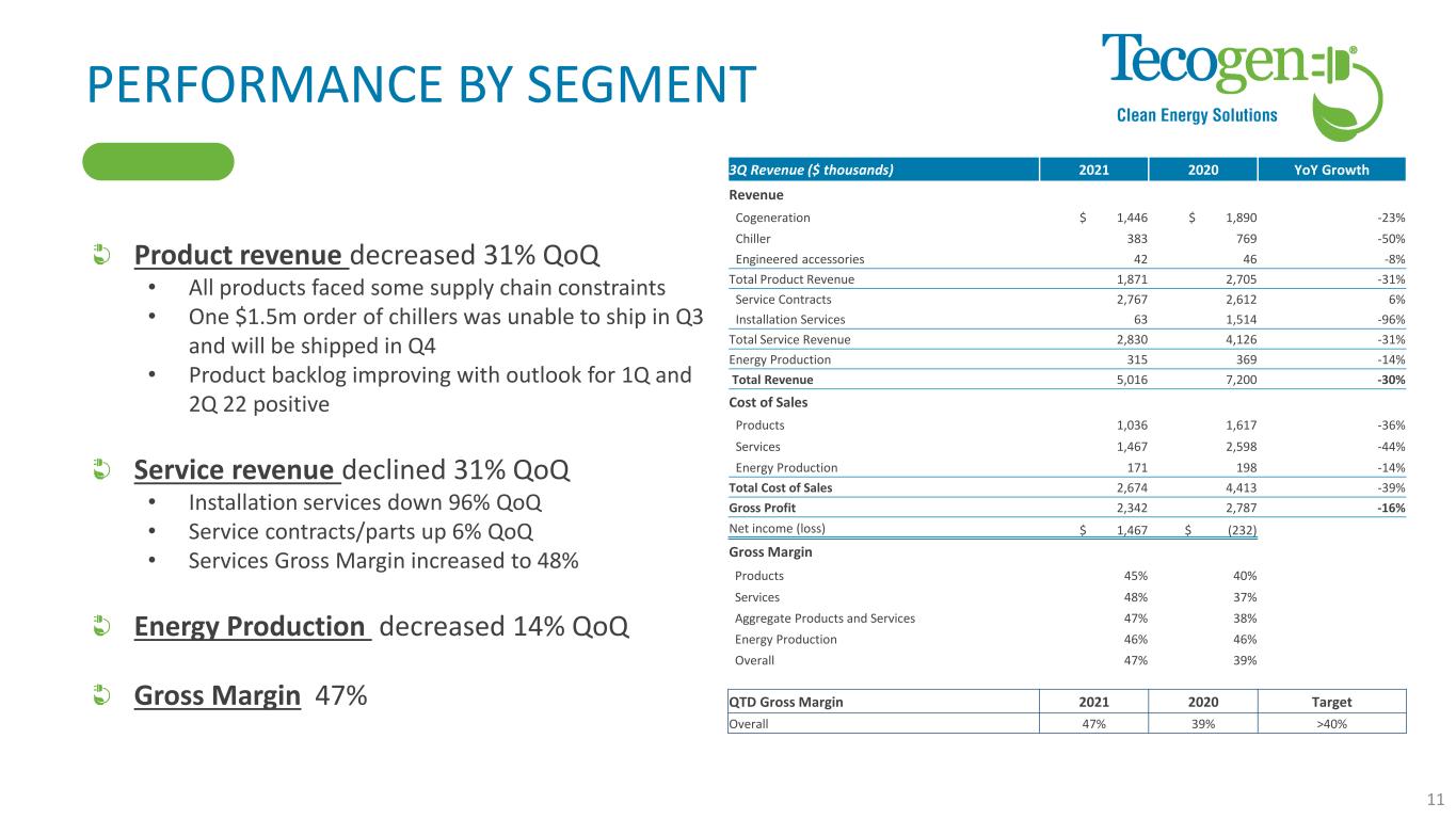 3Q 2021 ADJUSTED EBITDA RECONCILIATION EBITDA: Earnings Before Interest, Taxes, Depreciation & Amortization EBITDA favorably impacted by Employee Retention Credit of $562k EBITDA Non-cash adjustments • Stock based compensation • Forgiveness of PPP loan • Unrealized and realized (gain) loss on investment securities *Adjusted EBITDA is defined as net income (loss) attributable to Tecogen Inc, adjusted for interest, depreciation and amortization, stock-based compensation expense, unrealized loss on investment securities, non-cash abandonment of intangible assets, goodwill impairment and other non-recurring charges or gains including abandonment of certain intangible assets and extinguishment of debt 10 Non-GAAP financial disclosure (in thousands) 3Q 2021 3Q 2020 Net income (loss) attributable to Tecogen Inc. 1,467$ (232)$ Interest expense, net 9 5 Income tax expense 3 9 Depreciation & amortization, net 116 100 EBITDA 1,595 (117) Gain on extinguishment of debt (1,886) - Stock based compensation 57 51 Unrealized (gain) loss on marketable securities 37 - Adjusted EBITDA* (197)$ (67)$ Quarter Ended, Sept. 30,