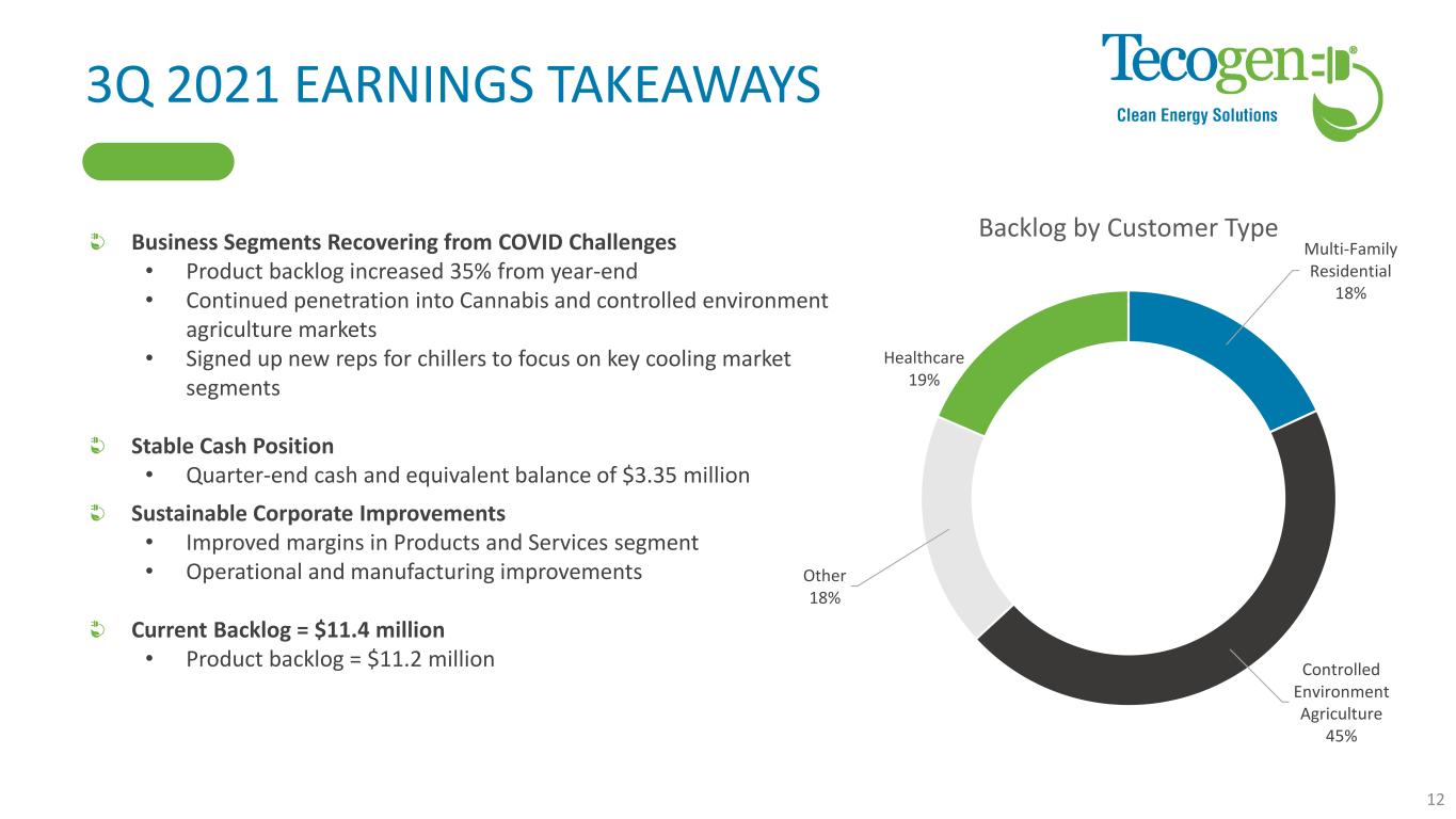 PERFORMANCE BY SEGMENT Product revenue decreased 31% QoQ • All products faced some supply chain constraints • One $1.5m order of chillers was unable to ship in Q3 and will be shipped in Q4 • Product backlog improving with outlook for 1Q and 2Q 22 positive Service revenue declined 31% QoQ • Installation services down 96% QoQ • Service contracts/parts up 6% QoQ • Services Gross Margin increased to 48% Energy Production decreased 14% QoQ Gross Margin 47% 11 3Q Revenue ($ thousands) 2021 2020 YoY Growth Revenue Cogeneration $ 1,446 $ 1,890 -23% Chiller 383 769 -50% Engineered accessories 42 46 -8% Total Product Revenue 1,871 2,705 -31% Service Contracts 2,767 2,612 6% Installation Services 63 1,514 -96% Total Service Revenue 2,830 4,126 -31% Energy Production 315 369 -14% Total Revenue 5,016 7,200 -30% Cost of Sales Products 1,036 1,617 -36% Services 1,467 2,598 -44% Energy Production 171 198 -14% Total Cost of Sales 2,674 4,413 -39% Gross Profit 2,342 2,787 -16% Net income (loss) $ 1,467 $ (232) Gross Margin Products 45% 40% Services 48% 37% Aggregate Products and Services 47% 38% Energy Production 46% 46% Overall 47% 39% QTD Gross Margin 2021 2020 Target Overall 47% 39% >40%