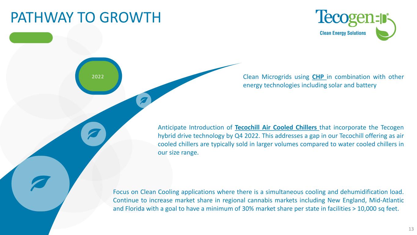 3Q 2021 EARNINGS TAKEAWAYS Business Segments Recovering from COVID Challenges • Product backlog increased 35% from year-end • Continued penetration into Cannabis and controlled environment agriculture markets • Signed up new reps for chillers to focus on key cooling market segments Stable Cash Position • Quarter-end cash and equivalent balance of $3.35 million Sustainable Corporate Improvements • Improved margins in Products and Services segment • Operational and manufacturing improvements Current Backlog = $11.4 million • Product backlog = $11.2 million Multi-Family Residential 18% Controlled Environment Agriculture 45% Other 18% Healthcare 19% Backlog by Customer Type 12