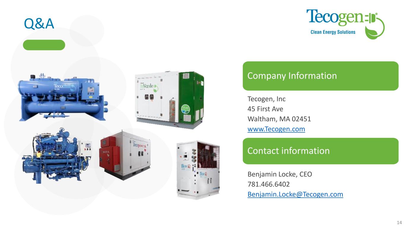 Q&A Company Information Tecogen, Inc 45 First Ave Waltham, MA 02451 www.Tecogen.com Contact information Benjamin Locke, CEO 781.466.6402 Benjamin.Locke@Tecogen.com 14