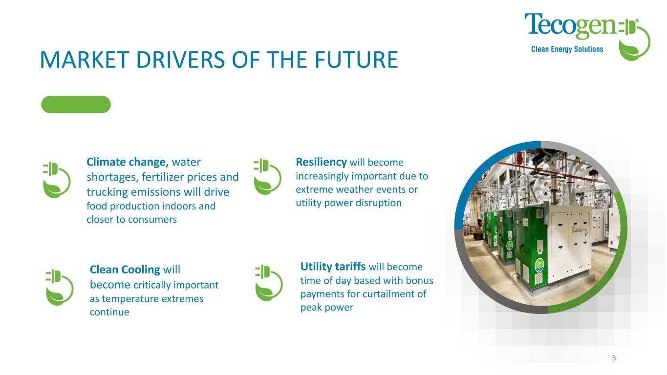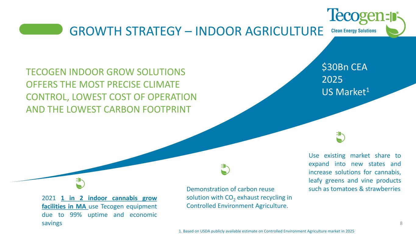Facilities with beds such as multi-family and nursing homes continue to be great prospects for our microgrid and conventional CHP solutions. Process applications with simultaneous cooling and de-humidification such as food, beverage and chemicals represent the next largest market potential. These sites have 24/7 operation, and our chillers offer significant savings compared to competing technologies. OTHER KEY MARKET SEGMENTS 9 Indoor agriculture provides the largest growth potential for Tecogen as this segment expands beyond cannabis and food crops are grown indoors. Food, $137 M Beverage, $16 M Chemical, $75 M Hospital, $122 M Nursing, $126 M Fitness and Rec, $61 M Multi-Family, $100 M Nationwide Market Potential per year Food Beverage Chemical Hospital Nursing Fitness and Rec Multi-Family