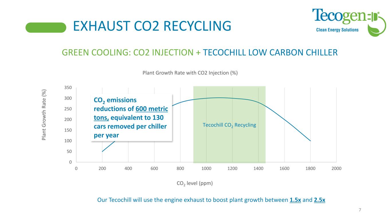 ENABLING LOW CARBON AGRICULTURE TECOGEN CLEAN COOLING SOLUTIONS 6 Offers the maximum operating savings, precision climate control, resiliency, and GHG reductions. Cooling Runs on natural gas engine. Hybrid drive chiller (launch 2023) will blend utility or solar power with natural gas engine to choose the greenest and lowest cost source of power. Hot water for cleaning, heating and humidity control CO2 to boost plant growth 90% less land and water usage >15x crop cycles per year vs 1 crop cycle a year outdoors 100% Organic with no harmful pesticides
