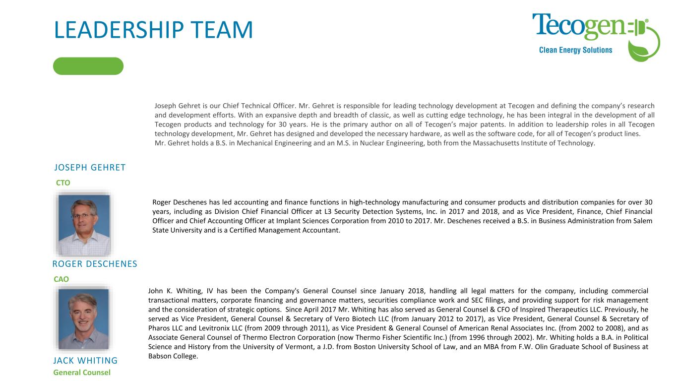 LEADERSHIP TEAM Roger Deschenes has led accounting and finance functions in high-technology manufacturing and consumer products and distribution companies for over 30 years, including as Division Chief Financial Officer at L3 Security Detection Systems, Inc. in 2017 and 2018, and as Vice President, Finance, Chief Financial Officer and Chief Accounting Officer at Implant Sciences Corporation from 2010 to 2017. Mr. Deschenes received a B.S. in Business Administration from Salem State University and is a Certified Management Accountant. CAO ROGER DESCHENES General Counsel JACK WHITING John K. Whiting, IV has been the Company's General Counsel since January 2018, handling all legal matters for the company, including commercial transactional matters, corporate financing and governance matters, securities compliance work and SEC filings, and providing support for risk management and the consideration of strategic options. Since April 2017 Mr. Whiting has also served as General Counsel & CFO of Inspired Therapeutics LLC. Previously, he served as Vice President, General Counsel & Secretary of Vero Biotech LLC (from January 2012 to 2017), as Vice President, General Counsel & Secretary of Pharos LLC and Levitronix LLC (from 2009 through 2011), as Vice President & General Counsel of American Renal Associates Inc. (from 2002 to 2008), and as Associate General Counsel of Thermo Electron Corporation (now Thermo Fisher Scientific Inc.) (from 1996 through 2002). Mr. Whiting holds a B.A. in Political Science and History from the University of Vermont, a J.D. from Boston University School of Law, and an MBA from F.W. Olin Graduate School of Business at Babson College. Joseph Gehret is our Chief Technical Officer. Mr. Gehret is responsible for leading technology development at Tecogen and defining the company’s research and development efforts. With an expansive depth and breadth of classic, as well as cutting edge technology, he has been integral in the development of all Tecogen products and technology for 30 years. He is the primary author on all of Tecogen’s major patents. In addition to leadership roles in all Tecogen technology development, Mr. Gehret has designed and developed the necessary hardware, as well as the software code, for all of Tecogen’s product lines. Mr. Gehret holds a B.S. in Mechanical Engineering and an M.S. in Nuclear Engineering, both from the Massachusetts Institute of Technology. CTO JOSEPH GEHRET