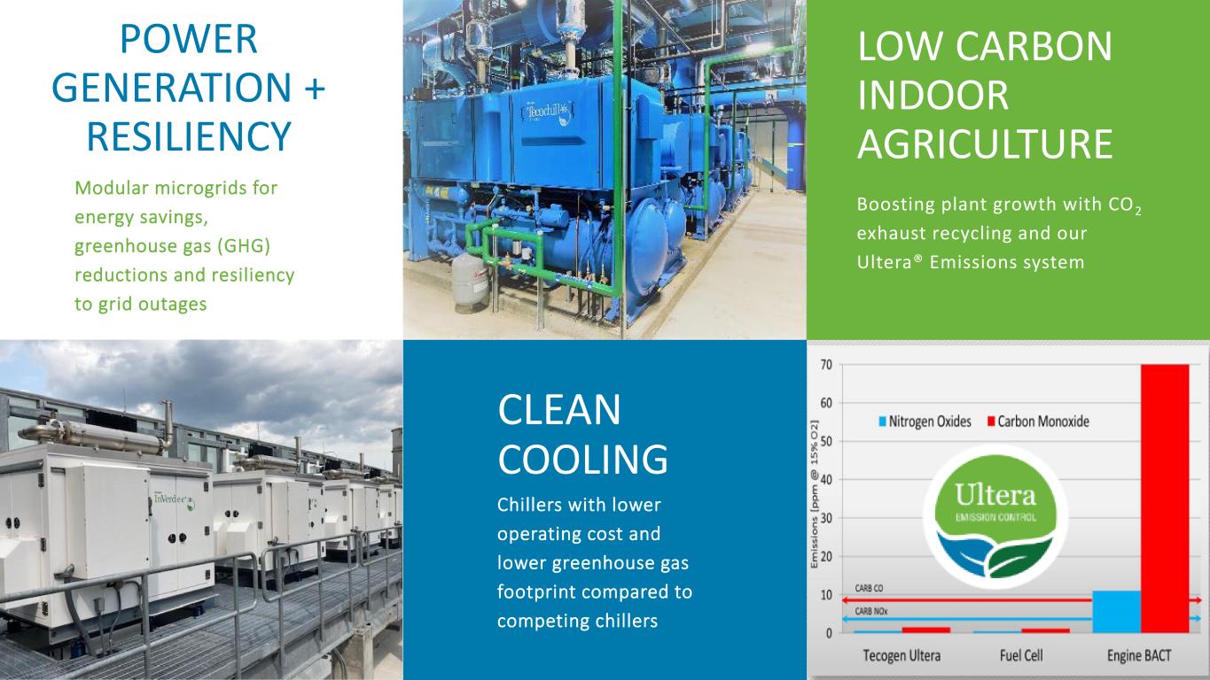 POWER GENERATION + RESILIENCY CLEAN COOLING Chillers with lower operating cost and lower greenhouse gas footprint compared to competing chillers LOW CARBON INDOOR AGRICULTURE Modular microgrids for energy savings, greenhouse gas (GHG) reductions and resiliency to grid outages Boosting plant growth with CO2 exhaust recycling and our Ultera® Emissions system