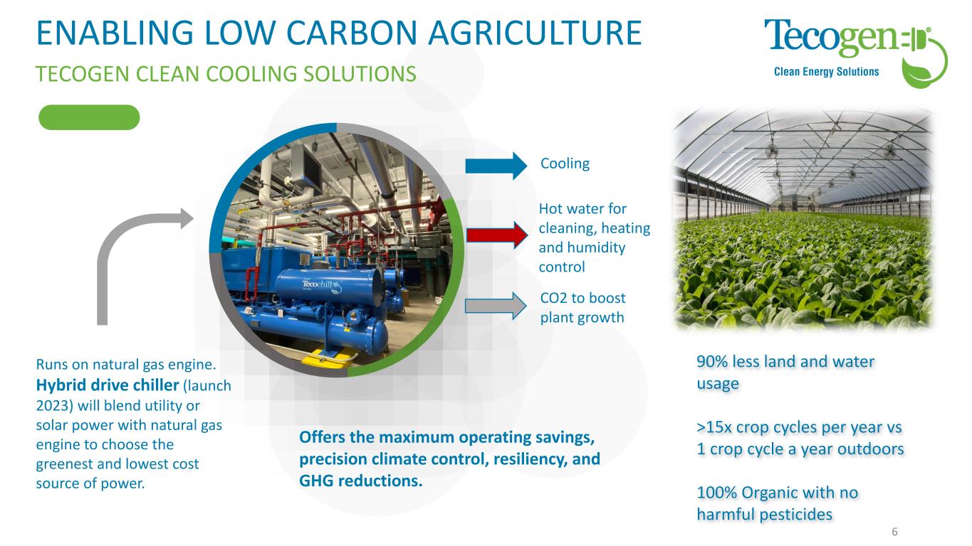 ENABLING LOW CARBON AGRICULTURE TECOGEN CLEAN COOLING SOLUTIONS 6 Offers the maximum operating savings, precision climate control, resiliency, and GHG reductions. Cooling Runs on natural gas engine. Hybrid drive chiller (launch 2023) will blend utility or solar power with natural gas engine to choose the greenest and lowest cost source of power. Hot water for cleaning, heating and humidity control CO2 to boost plant growth 90% less land and water usage >15x crop cycles per year vs 1 crop cycle a year outdoors 100% Organic with no harmful pesticides