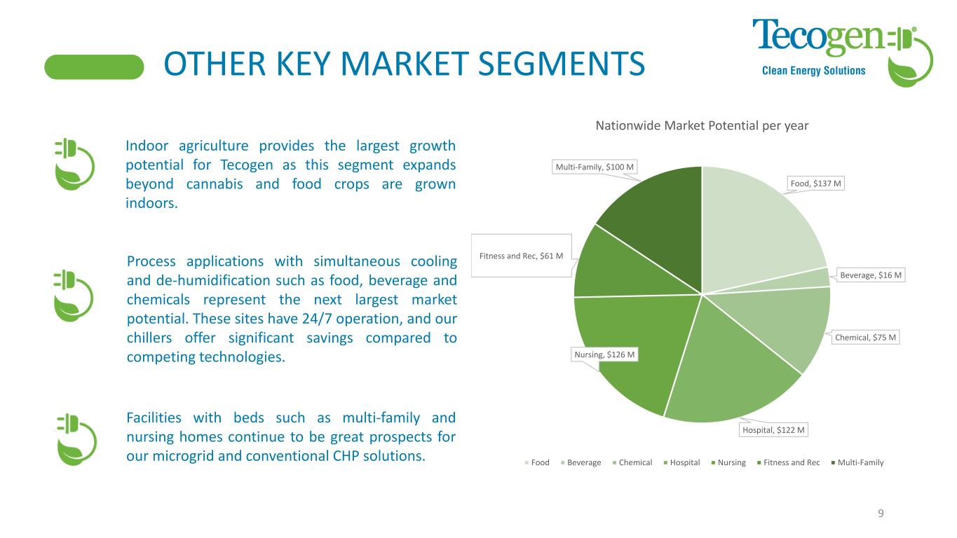 GROWTH STRATEGY – INDOOR AGRICULTURE TECOGEN INDOOR GROW SOLUTIONS OFFERS THE MOST PRECISE CLIMATE CONTROL, LOWEST COST OF OPERATION AND THE LOWEST CARBON FOOTPRINT 8 2021 1 in 2 indoor cannabis grow facilities in MA use Tecogen equipment due to 99% uptime and economic savings Demonstration of carbon reuse solution with CO2 exhaust recycling in Controlled Environment Agriculture. Use existing market share to expand into new states and increase solutions for cannabis, leafy greens and vine products such as tomatoes & strawberries $30Bn CEA 2025 US Market1 1. Based on USDA publicly available estimate on Controlled Environment Agriculture market in 2025