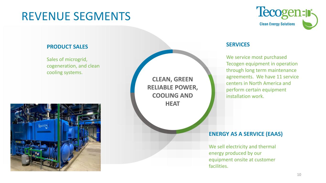 REVENUE SEGMENTS We service most purchased Tecogen equipment in operation through long term maintenance agreements. We have 11 service centers in North America and perform certain equipment installation work. SERVICES CLEAN, GREEN RELIABLE POWER, COOLING AND HEAT Sales of microgrid, cogeneration, and clean cooling systems. PRODUCT SALES We sell electricity and thermal energy produced by our equipment onsite at customer facilities. ENERGY AS A SERVICE (EAAS) 10