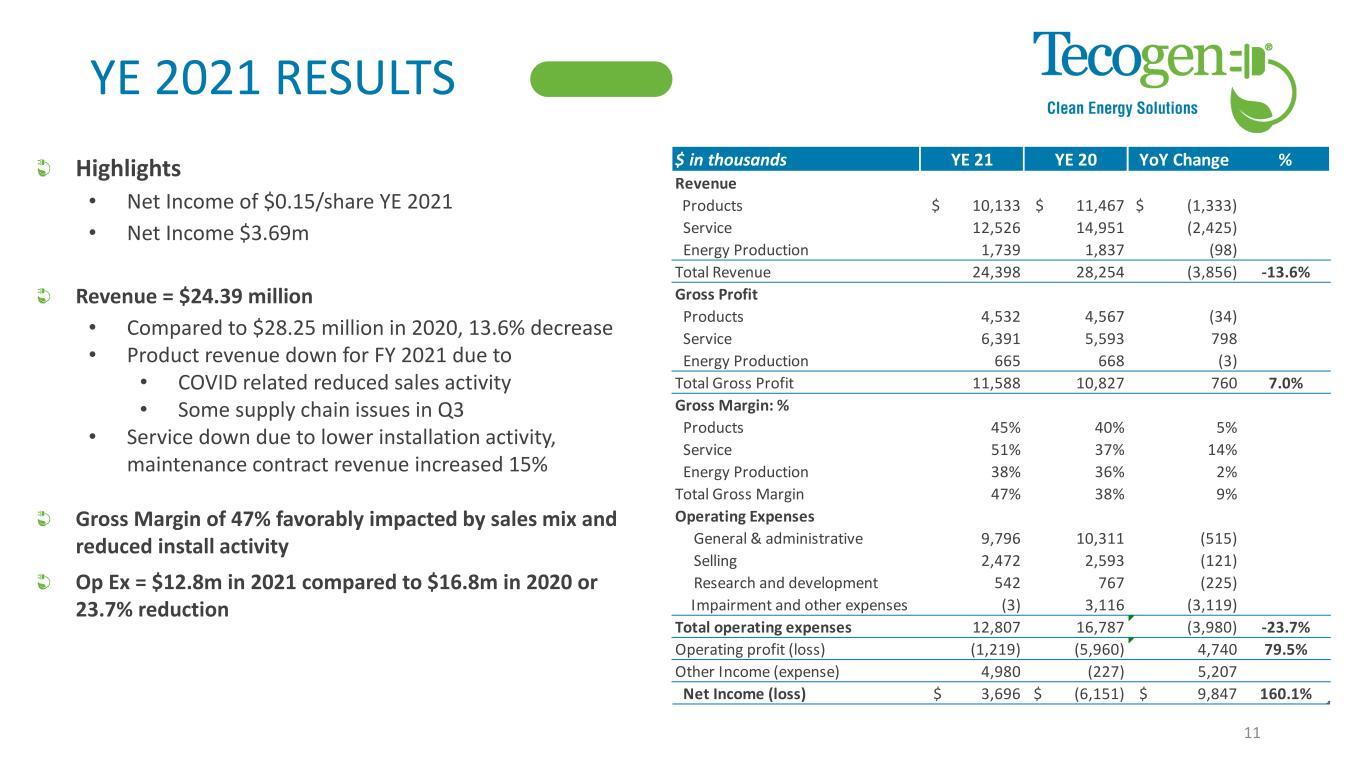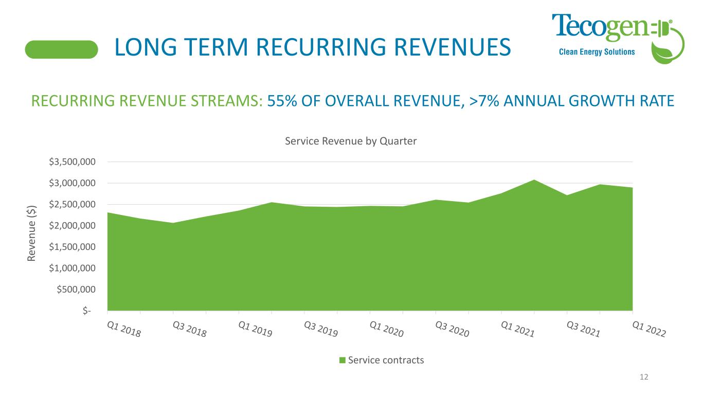 YE 2021 RESULTS Highlights • Net Income of $0.15/share YE 2021 • Net Income $3.69m Revenue = $24.39 million • Compared to $28.25 million in 2020, 13.6% decrease • Product revenue down for FY 2021 due to • COVID related reduced sales activity • Some supply chain issues in Q3 • Service down due to lower installation activity, maintenance contract revenue increased 15% Gross Margin of 47% favorably impacted by sales mix and reduced install activity Op Ex = $12.8m in 2021 compared to $16.8m in 2020 or 23.7% reduction 11 $ in thousands YE 21 YE 20 YoY Change % Revenue Products $ 10,133 $ 11,467 $ (1,333) Service 12,526 14,951 (2,425) Energy Production 1,739 1,837 (98) Total Revenue 24,398 28,254 (3,856) -13.6% Gross Profit Products 4,532 4,567 (34) Service 6,391 5,593 798 Energy Production 665 668 (3) Total Gross Profit 11,588 10,827 760 7.0% Gross Margin: % Products 45% 40% 5% Service 51% 37% 14% Energy Production 38% 36% 2% Total Gross Margin 47% 38% 9% Operating Expenses General & administrative 9,796 10,311 (515) Selling 2,472 2,593 (121) Research and development 542 767 (225) Impairment and other expenses (3) 3,116 (3,119) Total operating expenses 12,807 16,787 (3,980) -23.7% Operating profit (loss) (1,219) (5,960) 4,740 79.5% Other Income (expense) 4,980 (227) 5,207 Net Income (loss) $ 3,696 $ (6,151) $ 9,847 160.1%