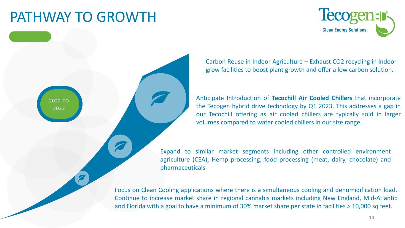 PATHWAY TO GROWTH 2022 TO 2023 14 Anticipate Introduction of Tecochill Air Cooled Chillers that incorporate the Tecogen hybrid drive technology by Q1 2023. This addresses a gap in our Tecochill offering as air cooled chillers are typically sold in larger volumes compared to water cooled chillers in our size range. Focus on Clean Cooling applications where there is a simultaneous cooling and dehumidification load. Continue to increase market share in regional cannabis markets including New England, Mid-Atlantic and Florida with a goal to have a minimum of 30% market share per state in facilities > 10,000 sq feet. Carbon Reuse in Indoor Agriculture – Exhaust CO2 recycling in indoor grow facilities to boost plant growth and offer a low carbon solution. Expand to similar market segments including other controlled environment agriculture (CEA), Hemp processing, food processing (meat, dairy, chocolate) and pharmaceuticals
