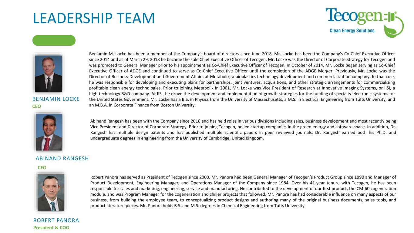 LEADERSHIP TEAM CEO BENJAMIN LOCKE Benjamin M. Locke has been a member of the Company's board of directors since June 2018. Mr. Locke has been the Company's Co-Chief Executive Officer since 2014 and as of March 29, 2018 he became the sole Chief Executive Officer of Tecogen. Mr. Locke was the Director of Corporate Strategy for Tecogen and was promoted to General Manager prior to his appointment as Co-Chief Executive Officer of Tecogen. In October of 2014, Mr. Locke began serving as Co-Chief Executive Officer of ADGE and continued to serve as Co-Chief Executive Officer until the completion of the ADGE Merger. Previously, Mr. Locke was the Director of Business Development and Government Affairs at Metabolix, a bioplastics technology development and commercialization company. In that role, he was responsible for developing and executing plans for partnerships, joint ventures, acquisitions, and other strategic arrangements for commercializing profitable clean energy technologies. Prior to joining Metabolix in 2001, Mr. Locke was Vice President of Research at Innovative Imaging Systems, or IISI, a high-technology R&D company. At IISI, he drove the development and implementation of growth strategies for the funding of specialty electronic systems for the United States Government. Mr. Locke has a B.S. in Physics from the University of Massachusetts, a M.S. in Electrical Engineering from Tufts University, and an M.B.A. in Corporate Finance from Boston University. Abinand Rangesh has been with the Company since 2016 and has held roles in various divisions including sales, business development and most recently being Vice President and Director of Corporate Strategy. Prior to joining Tecogen, he led startup companies in the green energy and software space. In addition, Dr. Rangesh has multiple design patents and has published multiple scientific papers in peer reviewed journals. Dr. Rangesh earned both his Ph.D. and undergraduate degrees in engineering from the University of Cambridge, United Kingdom. CFO ABINAND RANGESH President & COO ROBERT PANORA Robert Panora has served as President of Tecogen since 2000. Mr. Panora had been General Manager of Tecogen’s Product Group since 1990 and Manager of Product Development, Engineering Manager, and Operations Manager of the Company since 1984. Over his 41-year tenure with Tecogen, he has been responsible for sales and marketing, engineering, service and manufacturing. He contributed to the development of our first product, the CM-60 cogeneration module, and was Program Manager for the cogeneration and chiller projects that followed. Mr. Panora has had considerable influence on many aspects of our business, from building the employee team, to conceptualizing product designs and authoring many of the original business documents, sales tools, and product literature pieces. Mr. Panora holds B.S. and M.S. degrees in Chemical Engineering from Tufts University.