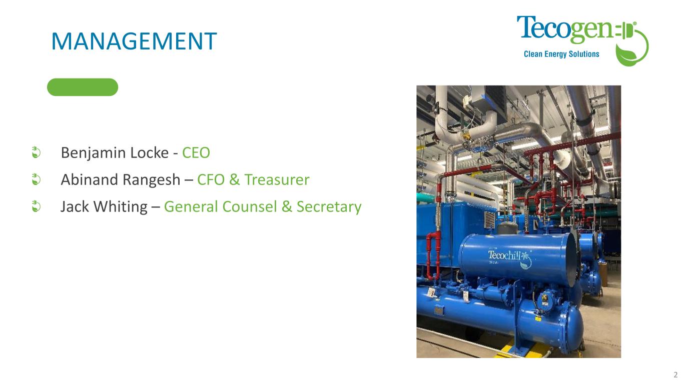 Q&A Company Information Tecogen, Inc 45 First Ave Waltham, MA 02451 www.Tecogen.com Contact information Benjamin Locke, CEO 781.466.6402 Benjamin.Locke@Tecogen.com 14