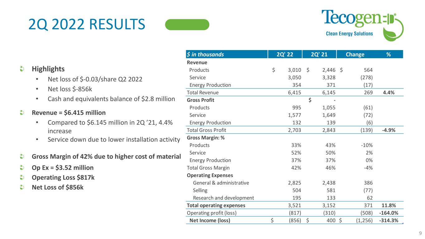 2Q 2022 RESULTS Highlights • Net loss of $-0.03/share Q2 2022 • Net loss $-856k • Cash and equivalents balance of $2.8 million Revenue = $6.415 million • Compared to $6.145 million in 2Q ’21, 4.4% increase • Service down due to lower installation activity Gross Margin of 42% due to higher cost of material Op Ex = $3.52 million Operating Loss $817k Net Loss of $856k 9 $ in thousands 2Q' 22 2Q' 21 Change % Revenue Products $ 3,010 $ 2,446 $ 564 Service 3,050 3,328 (278) Energy Production 354 371 (17) Total Revenue 6,415 6,145 269 4.4% Gross Profit $ - Products 995 1,055 (61) Service 1,577 1,649 (72) Energy Production 132 139 (6) Total Gross Profit 2,703 2,843 (139) -4.9% Gross Margin: % Products 33% 43% -10% Service 52% 50% 2% Energy Production 37% 37% 0% Total Gross Margin 42% 46% -4% Operating Expenses General & administrative 2,825 2,438 386 Selling 504 581 (77) Research and development 195 133 62 Total operating expenses 3,521 3,152 371 11.8% Operating profit (loss) (817) (310) (508) -164.0% Net Income (loss) $ (856) $ 400 $ (1,256) -314.3%