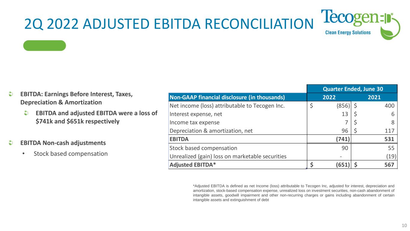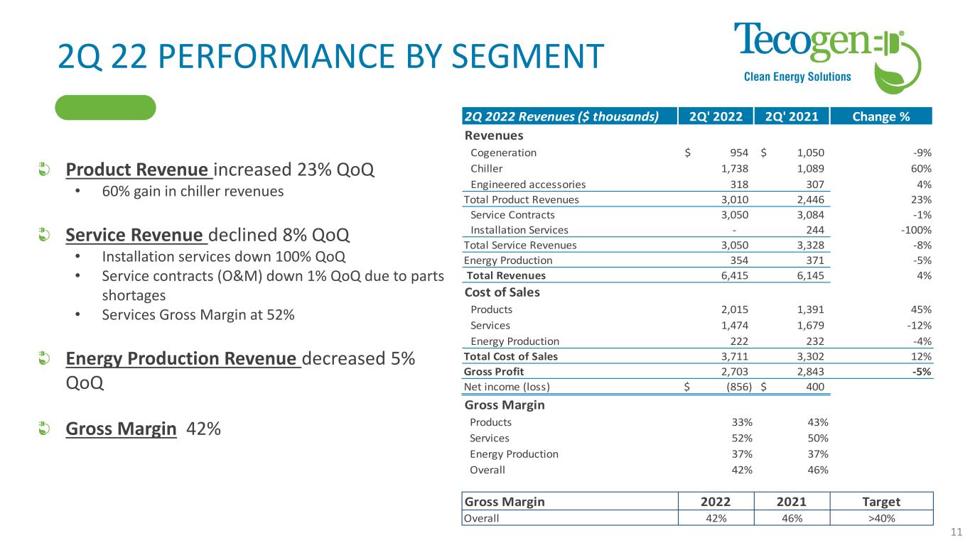 2Q 2022 ADJUSTED EBITDA RECONCILIATION EBITDA: Earnings Before Interest, Taxes, Depreciation & Amortization EBITDA and adjusted EBITDA were a loss of $741k and $651k respectively EBITDA Non-cash adjustments • Stock based compensation *Adjusted EBITDA is defined as net Income (loss) attributable to Tecogen Inc, adjusted for interest, depreciation and amortization, stock-based compensation expense, unrealized loss on investment securities, non-cash abandonment of intangible assets, goodwill impairment and other non-recurring charges or gains including abandonment of certain intangible assets and extinguishment of debt 10 Non-GAAP financial disclosure (in thousands) 2022 2021 Net income (loss) attributable to Tecogen Inc. (856)$ 400$ Interest expense, net 13 6$ Income tax expense 7 8$ Depreciation & amortization, net 96 117$ EBITDA (741) 531 Stock based compensation 90 55 Unrealized (gain) loss on marketable securities - (19) Adjusted EBITDA* (651)$ 567$ Quarter Ended, June 30
