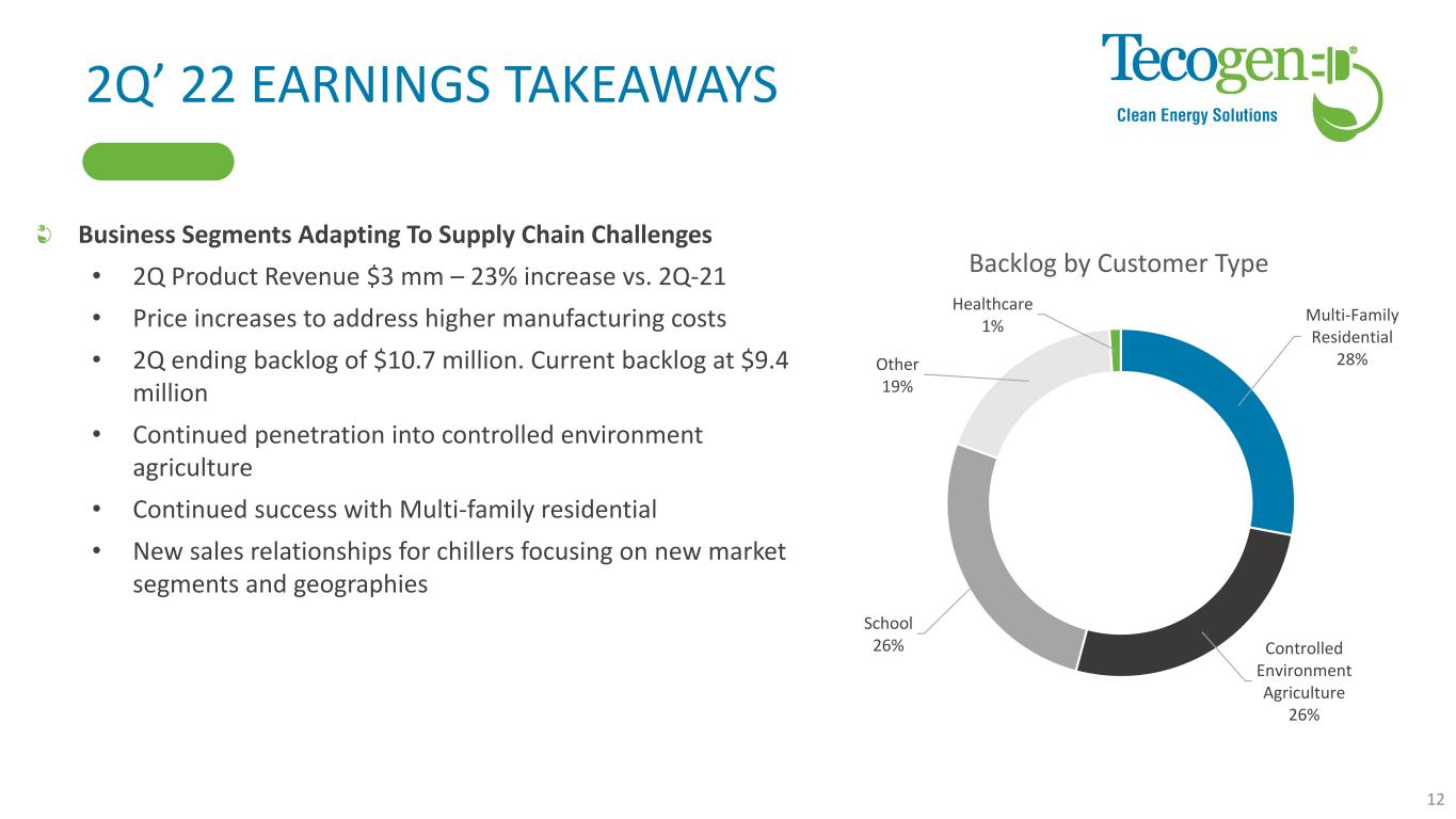 2Q 22 PERFORMANCE BY SEGMENT Product Revenue increased 23% QoQ • 60% gain in chiller revenues Service Revenue declined 8% QoQ • Installation services down 100% QoQ • Service contracts (O&M) down 1% QoQ due to parts shortages • Services Gross Margin at 52% Energy Production Revenue decreased 5% QoQ Gross Margin 42% 11 2Q 2022 Revenues ($ thousands) 2Q' 2022 2Q' 2021 Change % Revenues Cogeneration 954$ 1,050$ -9% Chiller 1,738 1,089 60% Engineered accessories 318 307 4% Total Product Revenues 3,010 2,446 23% Service Contracts 3,050 3,084 -1% Installation Services - 244 -100% Total Service Revenues 3,050 3,328 -8% Energy Production 354 371 -5% Total Revenues 6,415 6,145 4% Cost of Sales Products 2,015 1,391 45% Services 1,474 1,679 -12% Energy Production 222 232 -4% Total Cost of Sales 3,711 3,302 12% Gross Profit 2,703 2,843 -5% Net income (loss) (856)$ 400$ Gross Margin Products 33% 43% Services 52% 50% Energy Production 37% 37% Overall 42% 46% Gross Margin 2022 2021 Target Overall 42% 46% >40%