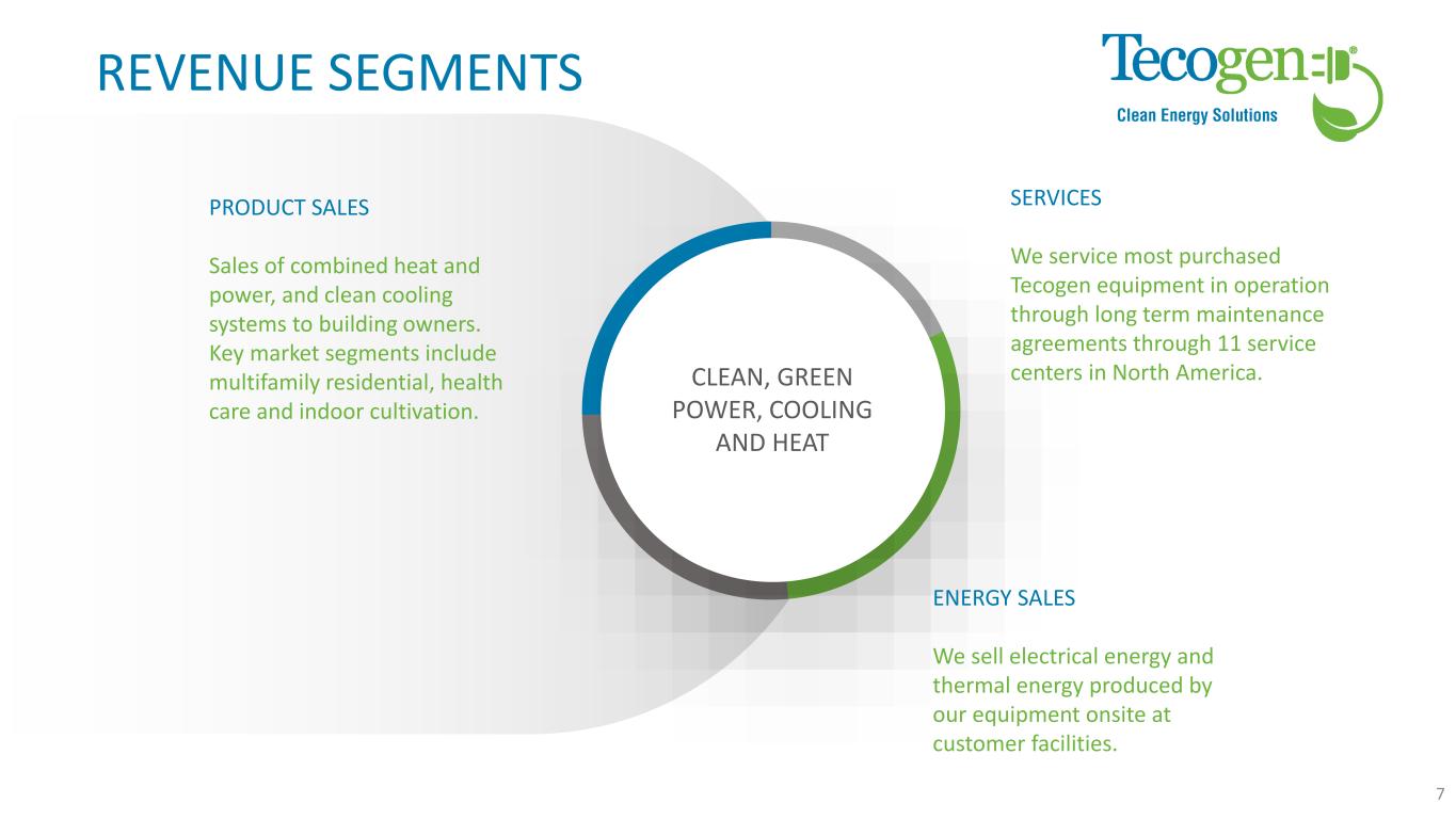 REVENUE SEGMENTS We service most purchased Tecogen equipment in operation through long term maintenance agreements through 11 service centers in North America. SERVICES CLEAN, GREEN POWER, COOLING AND HEAT Sales of combined heat and power, and clean cooling systems to building owners. Key market segments include multifamily residential, health care and indoor cultivation. PRODUCT SALES We sell electrical energy and thermal energy produced by our equipment onsite at customer facilities. ENERGY SALES 7