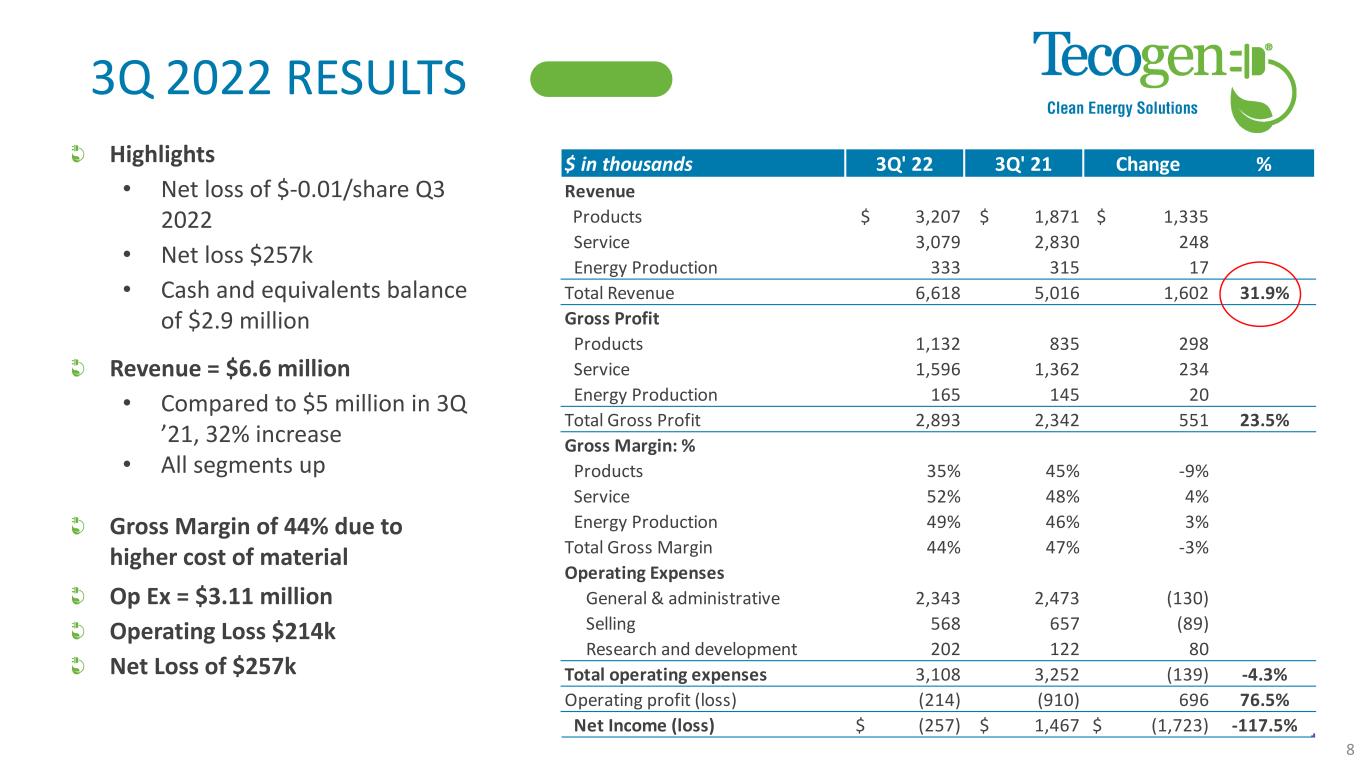 3Q 2022 RESULTS Highlights • Net loss of $-0.01/share Q3 2022 • Net loss $257k • Cash and equivalents balance of $2.9 million Revenue = $6.6 million • Compared to $5 million in 3Q ’21, 32% increase • All segments up Gross Margin of 44% due to higher cost of material Op Ex = $3.11 million Operating Loss $214k Net Loss of $257k 8 $ in thousands 3Q' 22 3Q' 21 Change % Revenue Products $ 3,207 $ 1,871 $ 1,335 Service 3,079 2,830 248 Energy Production 333 315 17 Total Revenue 6,618 5,016 1,602 31.9% Gross Profit Products 1,132 835 298 Service 1,596 1,362 234 Energy Production 165 145 20 Total Gross Profit 2,893 2,342 551 23.5% Gross Margin: % Products 35% 45% -9% Service 52% 48% 4% Energy Production 49% 46% 3% Total Gross Margin 44% 47% -3% Operating Expenses General & administrative 2,343 2,473 (130) Selling 568 657 (89) Research and development 202 122 80 Total operating expenses 3,108 3,252 (139) -4.3% Operating profit (loss) (214) (910) 696 76.5% Net Income (loss) $ (257) $ 1,467 $ (1,723) -117.5%