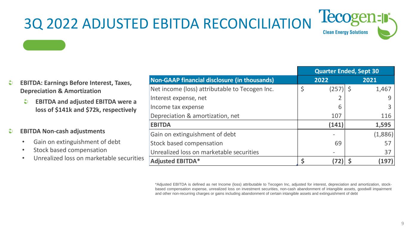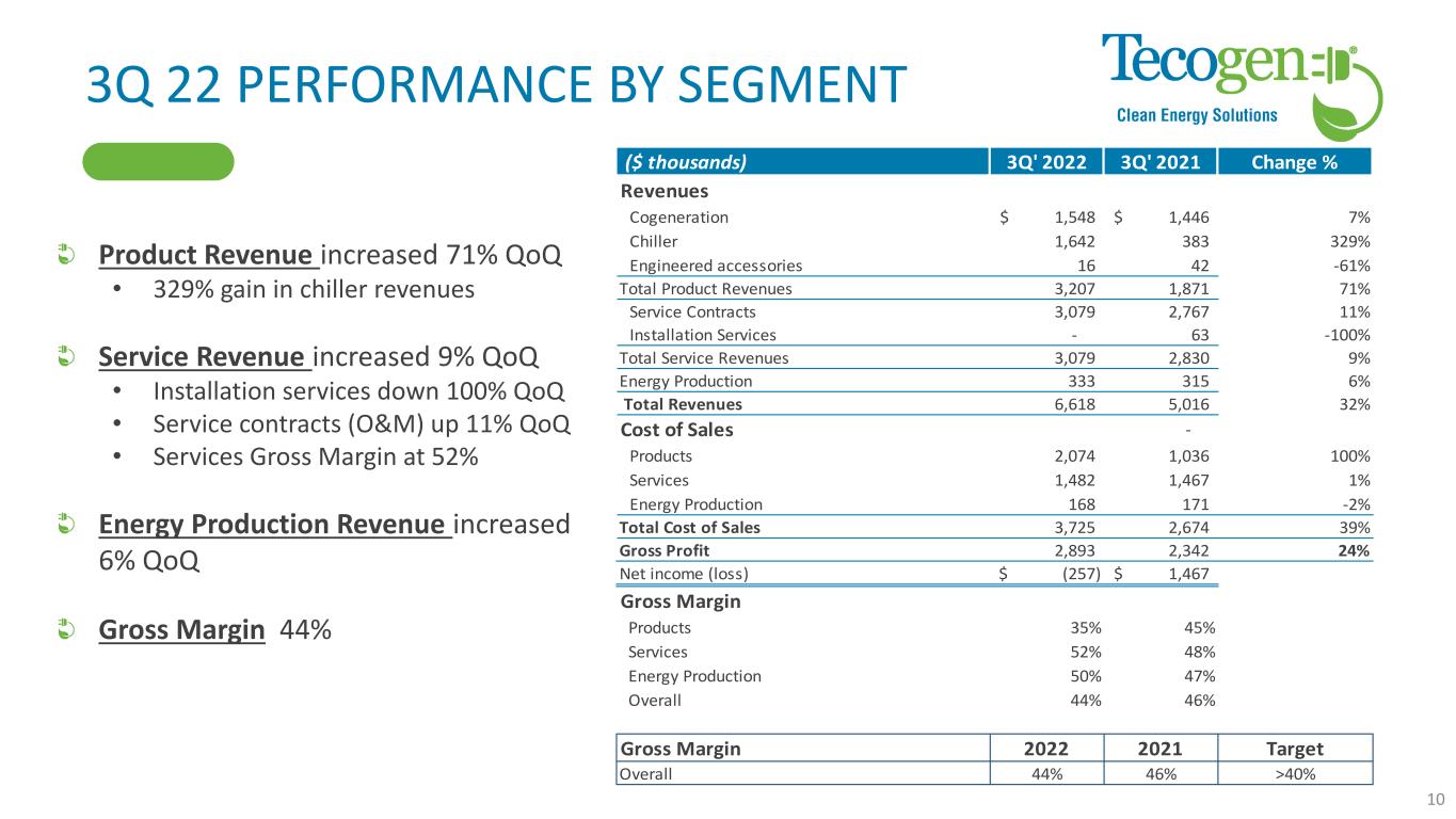 3Q 2022 ADJUSTED EBITDA RECONCILIATION EBITDA: Earnings Before Interest, Taxes, Depreciation & Amortization EBITDA and adjusted EBITDA were a loss of $141k and $72k, respectively EBITDA Non-cash adjustments • Gain on extinguishment of debt • Stock based compensation • Unrealized loss on marketable securities *Adjusted EBITDA is defined as net Income (loss) attributable to Tecogen Inc, adjusted for interest, depreciation and amortization, stock- based compensation expense, unrealized loss on investment securities, non-cash abandonment of intangible assets, goodwill impairment and other non-recurring charges or gains including abandonment of certain intangible assets and extinguishment of debt 9 Non-GAAP financial disclosure (in thousands) 2022 2021 Net income (loss) attributable to Tecogen Inc. (257)$ 1,467$ Interest expense, net 2 9 Income tax expense 6 3 Depreciation & amortization, net 107 116 EBITDA (141) 1,595 Gain on extinguishment of debt - (1,886) Stock based compensation 69 57 Unrealized loss on marketable securities - 37 Adjusted EBITDA* (72)$ (197)$ Quarter Ended, Sept 30