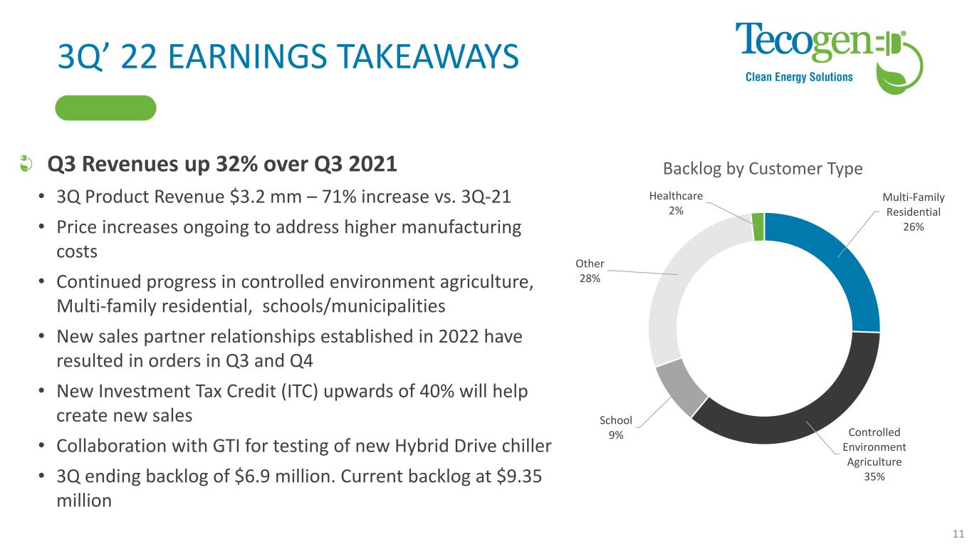 3Q 22 PERFORMANCE BY SEGMENT Product Revenue increased 71% QoQ • 329% gain in chiller revenues Service Revenue increased 9% QoQ • Installation services down 100% QoQ • Service contracts (O&M) up 11% QoQ • Services Gross Margin at 52% Energy Production Revenue increased 6% QoQ Gross Margin 44% 10 ($ thousands) 3Q' 2022 3Q' 2021 Change % Revenues Cogeneration 1,548$ 1,446$ 7% Chiller 1,642 383 329% Engineered accessories 16 42 -61% Total Product Revenues 3,207 1,871 71% Service Contracts 3,079 2,767 11% Installation Services - 63 -100% Total Service Revenues 3,079 2,830 9% Energy Production 333 315 6% Total Revenues 6,618 5,016 32% Cost of Sales - Products 2,074 1,036 100% Services 1,482 1,467 1% Energy Production 168 171 -2% Total Cost of Sales 3,725 2,674 39% Gross Profit 2,893 2,342 24% Net income (loss) (257)$ 1,467$ Gross Margin Products 35% 45% Services 52% 48% Energy Production 50% 47% Overall 44% 46% Gross Margin 2022 2021 Target Overall 44% 46% >40%